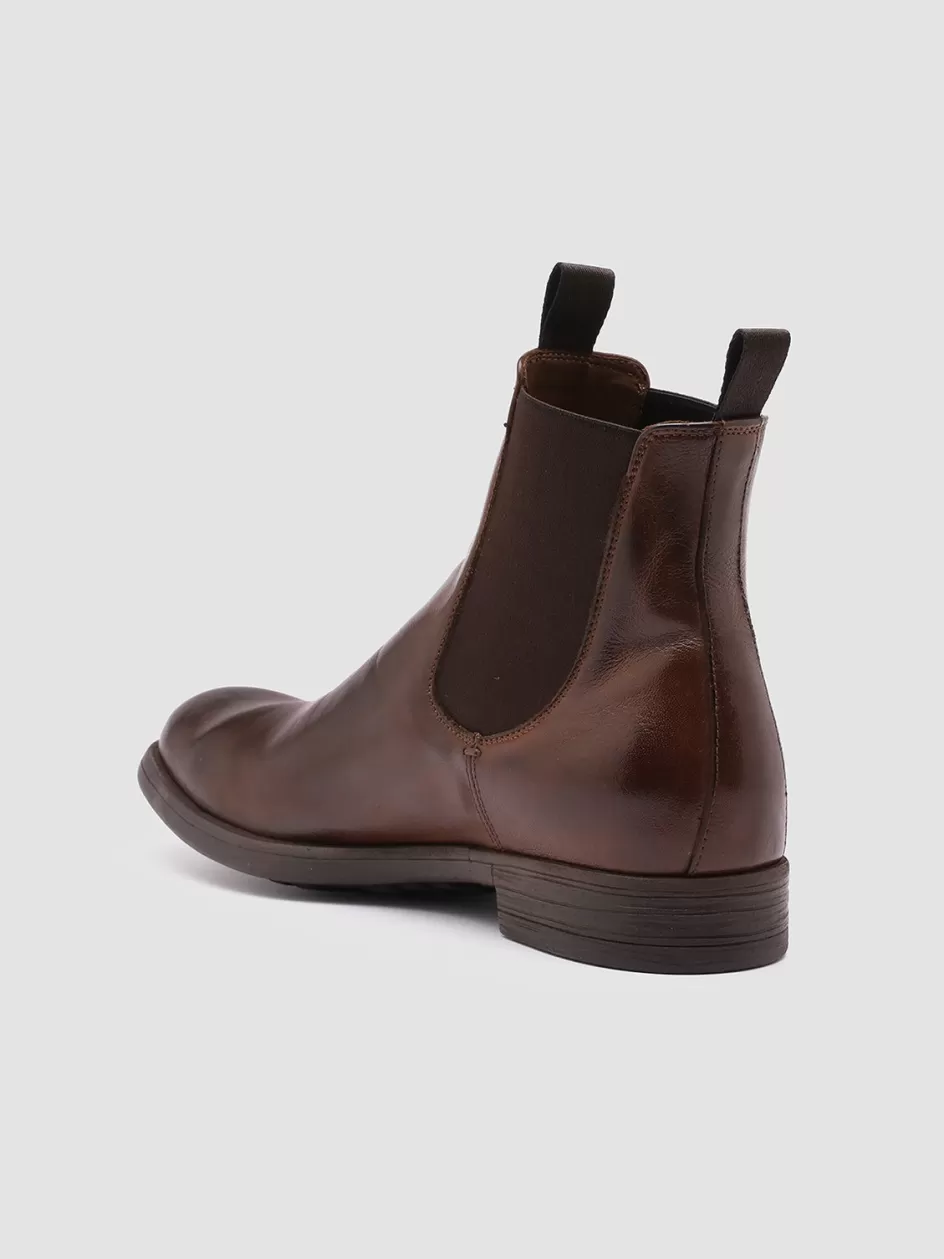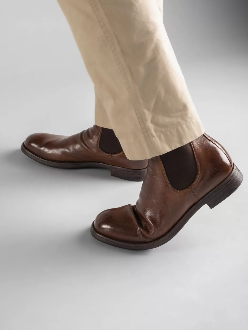 Versatile and very comfortable our Chronicle Chelsea boots feature a contemporary style. They are made by our skilled artisans from brown fine leather and characterized by a rounded almond toe elasticized side inserts for a perfect fit two original grosgrain pull tabs and a caoutchouc grip sole with a stacked heel.