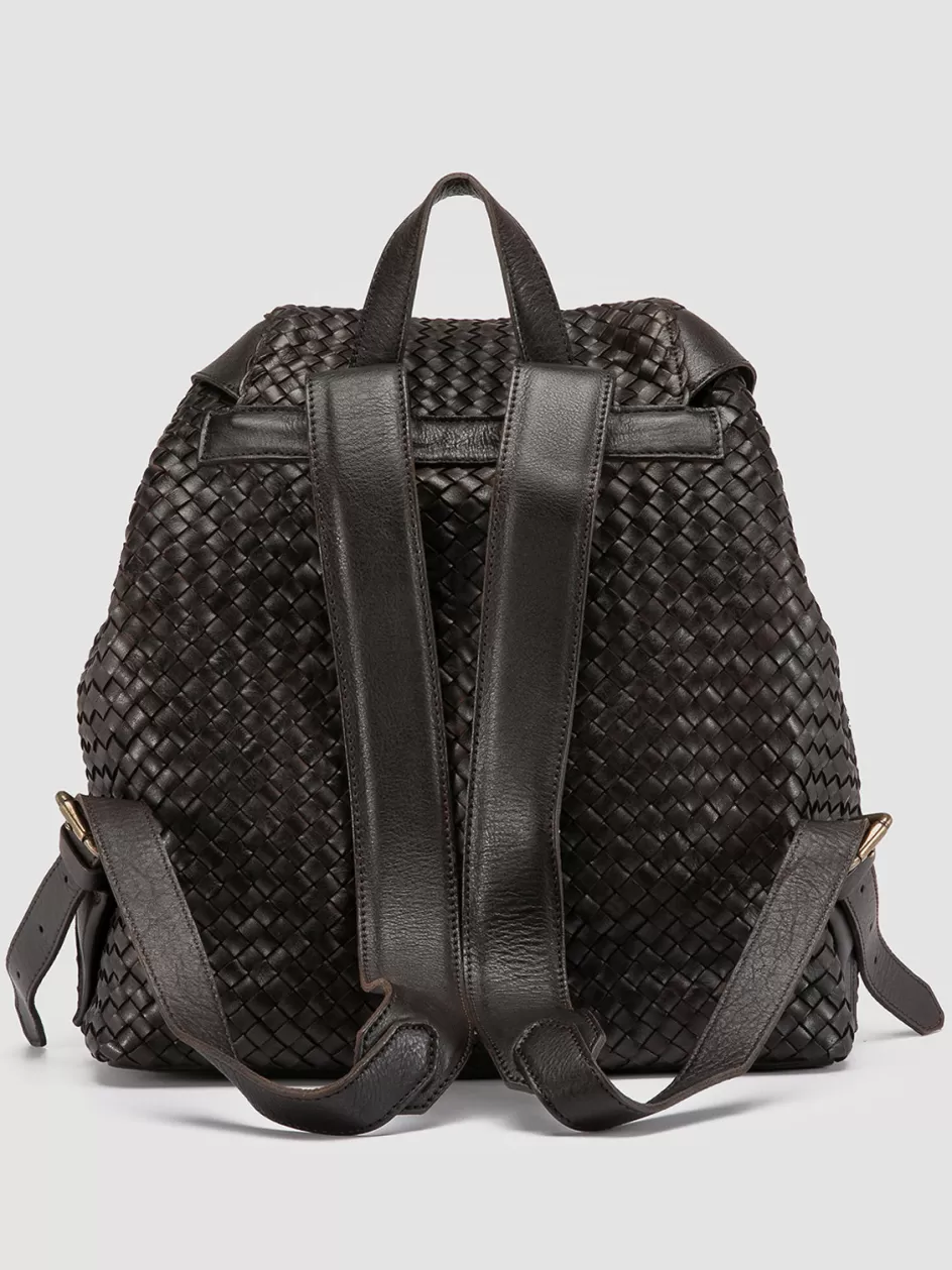 The OC Class 37 Woven backpack in hand-woven brown leather is a sophisticated and versatile piece crafted in Italy. It features a rich design equipped with adjustable shoulder straps and multiple storage compartments for practical organisation.