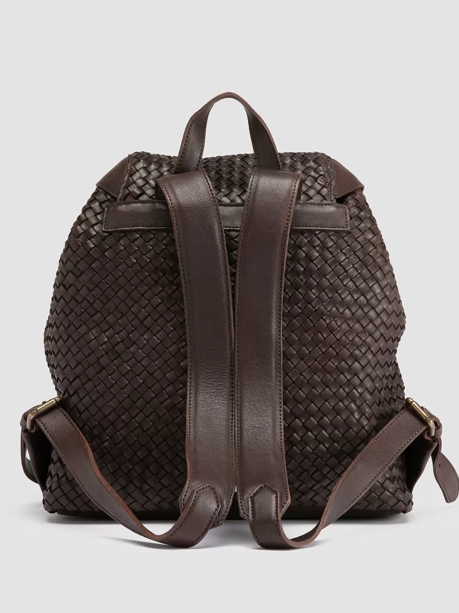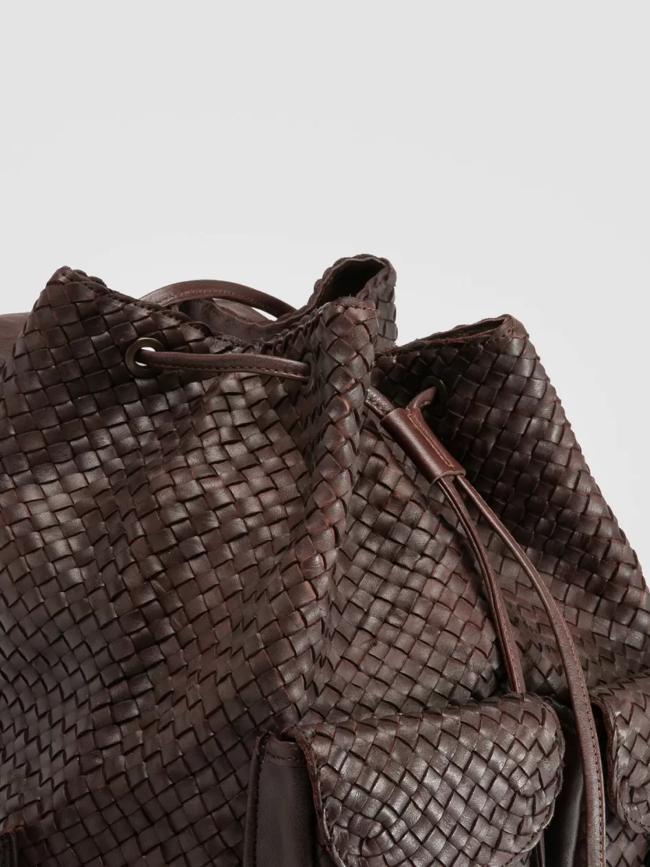 The OC Class 37 Woven backpack in hand-woven brown leather is a sophisticated and versatile piece crafted in Italy. It features a rich design equipped with adjustable shoulder straps and multiple storage compartments for practical organisation.