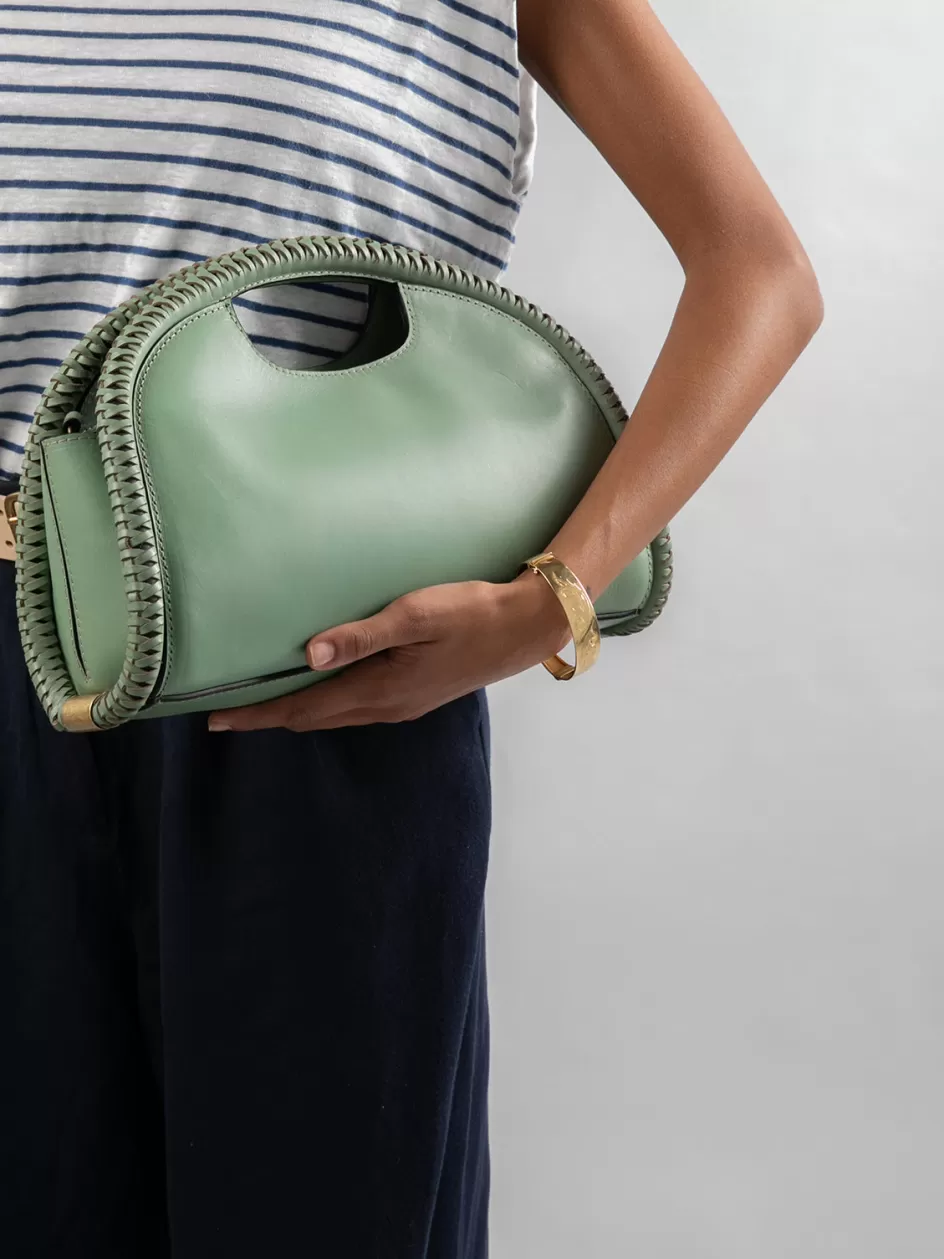 A rounded silhouette highlighted by woven leather profiles with golden details on the sides distinguishes our CABALA clutch bag in precious light brown leather. Featuring an adjustable and detachable shoulder strap, it reveals our lettering logo printed on the back, internal panel with magnetic fastening, suede lining, internal zip pocket and antiqued gold-tone metal hardware.