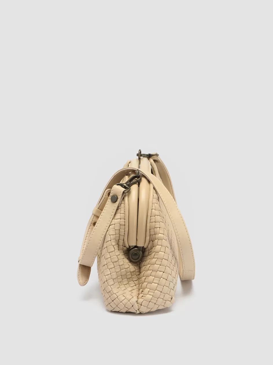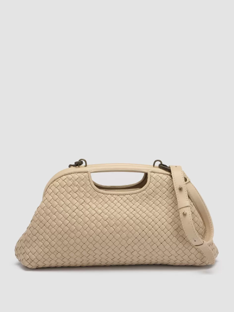 Our exclusive Helen clutch bag comes in premium beige woven leather and is great to take by hand or as a crossbody thanks to the thin adjustable and detachable shoulder strap. Expertly handcrafted it reveals an inner leather band with magnetic closure and our gold-tone lettering logo print fabric lining and an internal zip pocket.