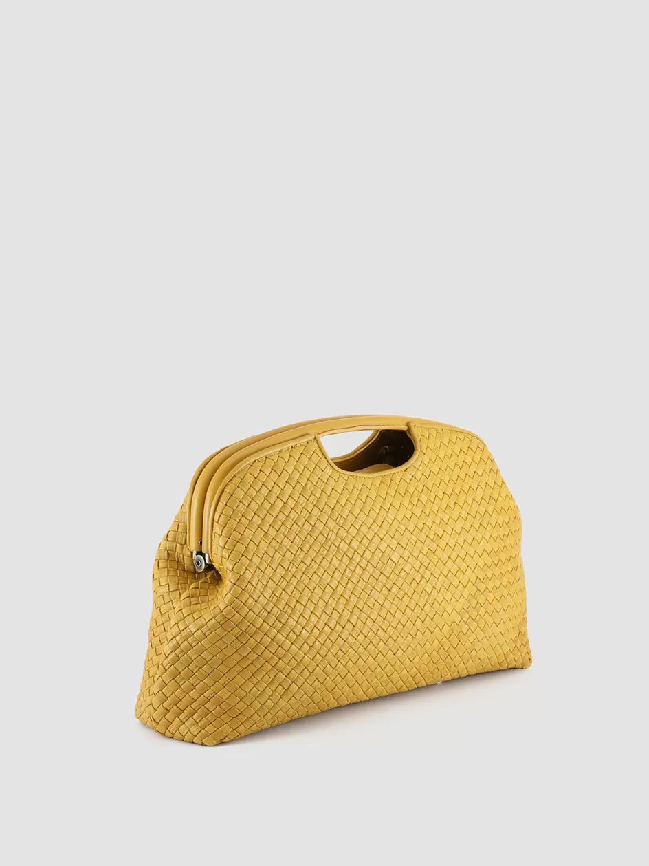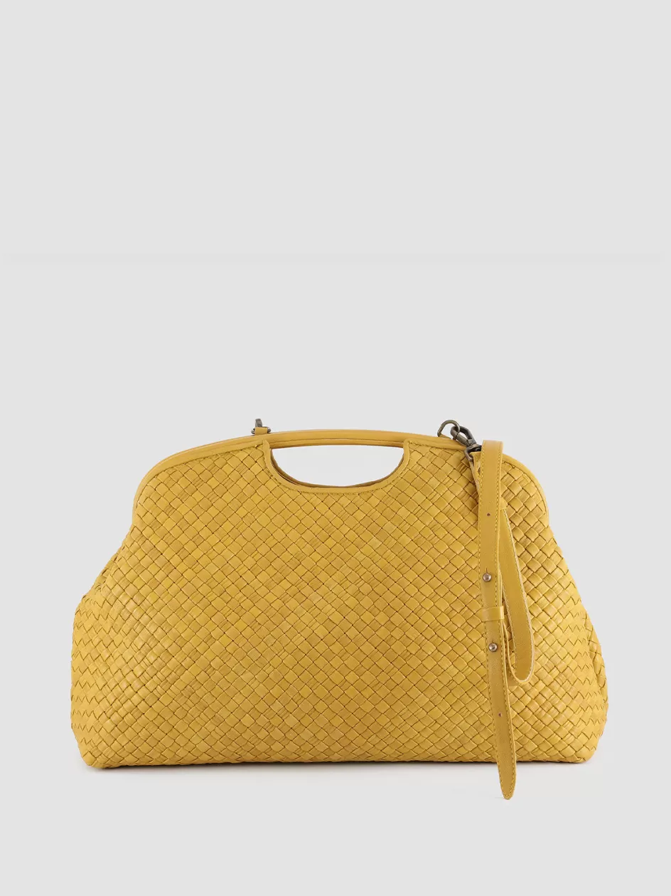 Made from premium yellow leather, the Helen 09 clutch bag showcases a unique and elegant handwoven texture that adds depth to the structural form. It features an oval top handle and a detachable shoulder strap.