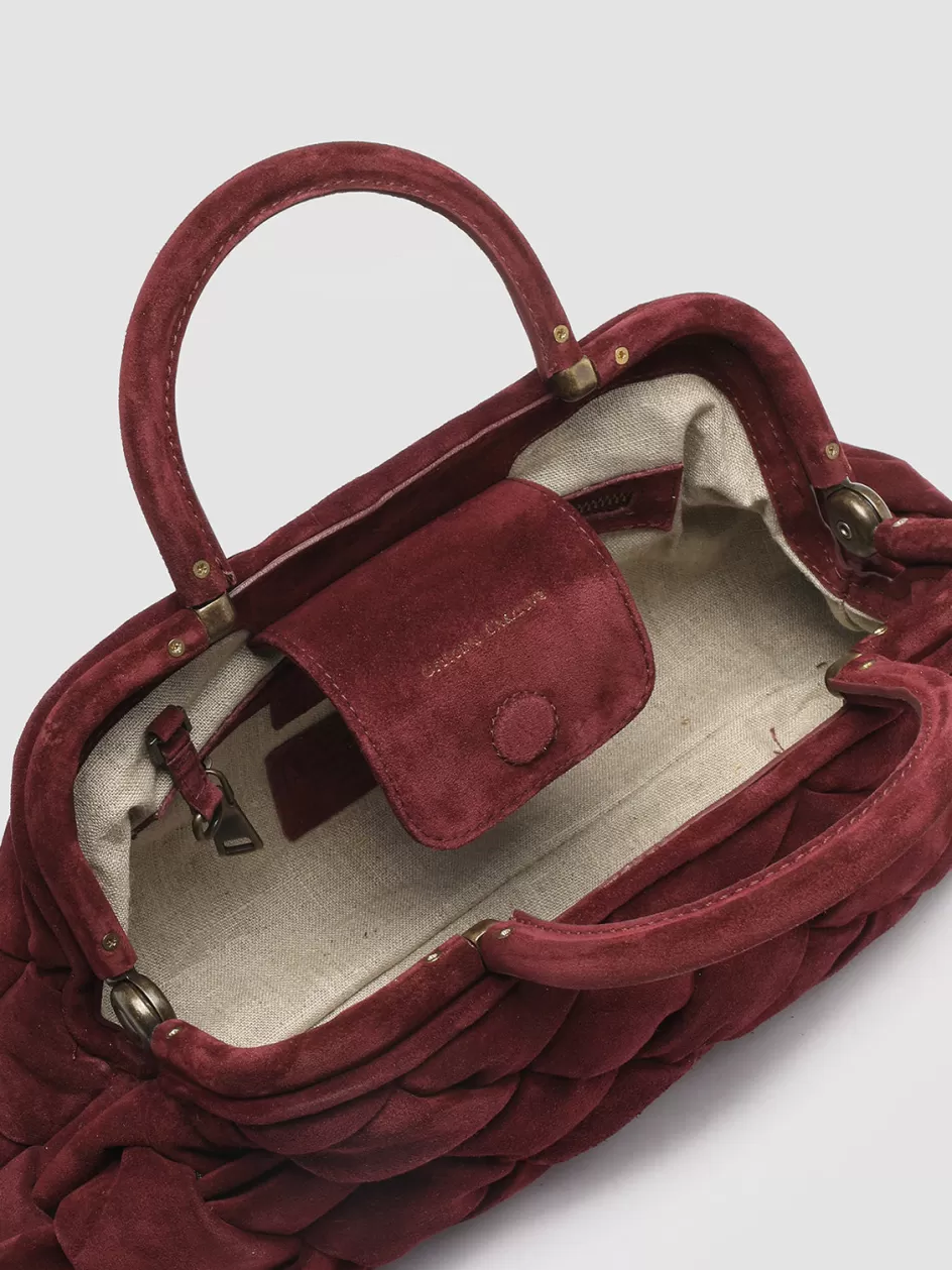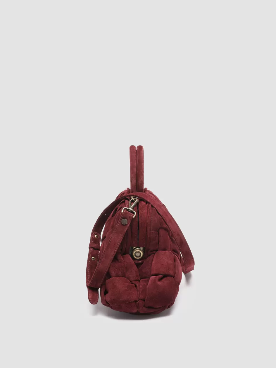 The Helen 21 Massive handle bag comes in sumptuous burgundy suede, intricately handwoven to create a textured, quilted appearance. This opulent model features sturdy top handles, a detachable shoulder strap and a fabric-lined interior with a magnetic closure.