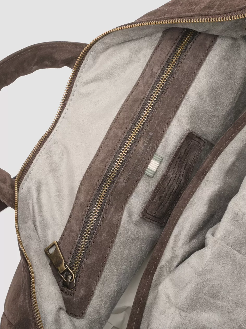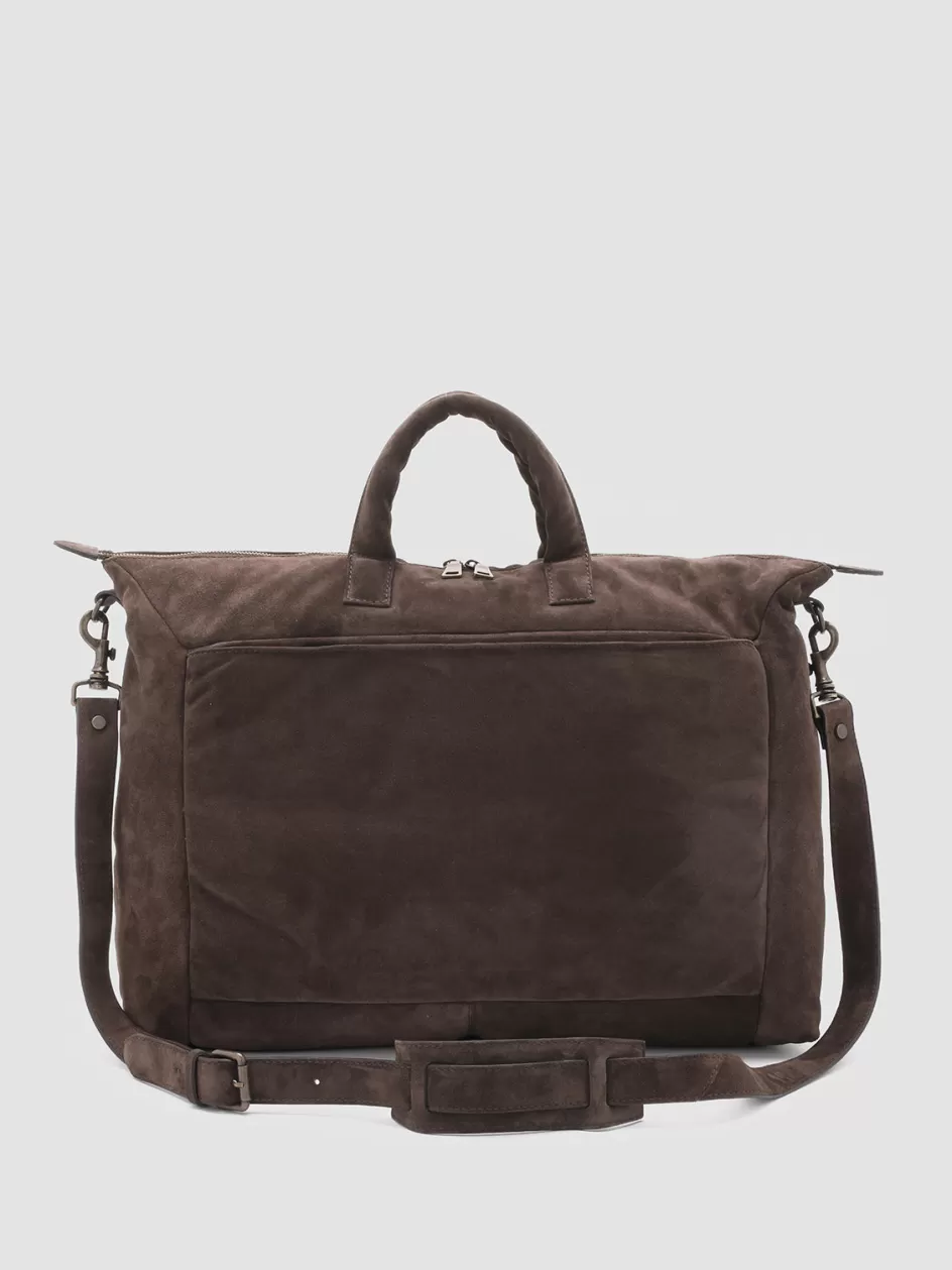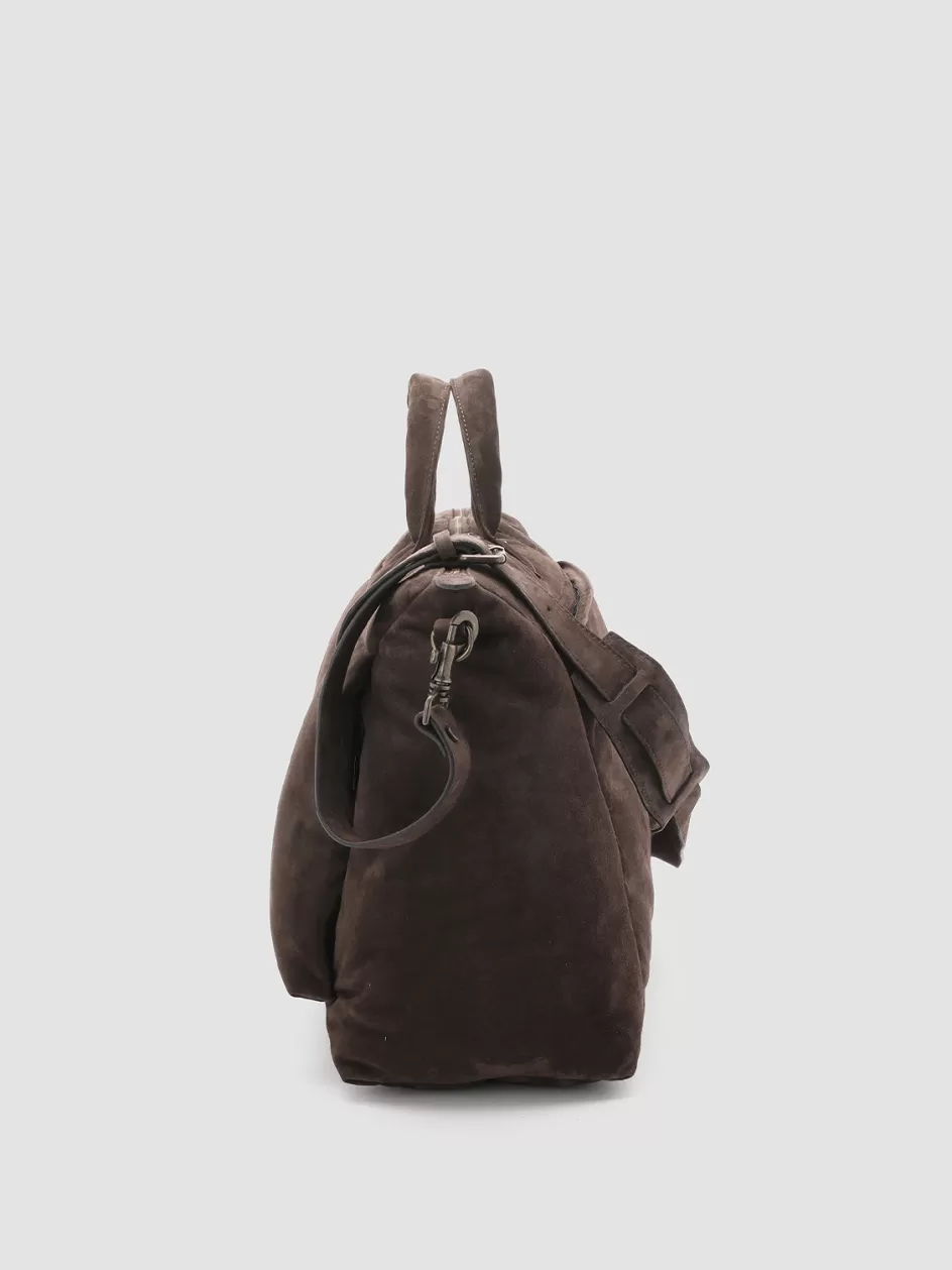 Our Helmet handcrafted bag features a roomy and practical silhouette that is decidedly unique. It is made by our peerless artisans from fine brown airbrushed smooth suede and features two padded leather top handles, two-way zipped main compartment, two front pockets with concealed side zip, leather tab with embossed lettering logo, adjustable and detachable shoulder strap, back zip pocket, suede lining with two inner pockets one of which zips, and antiqued gold-tone metal hardware.