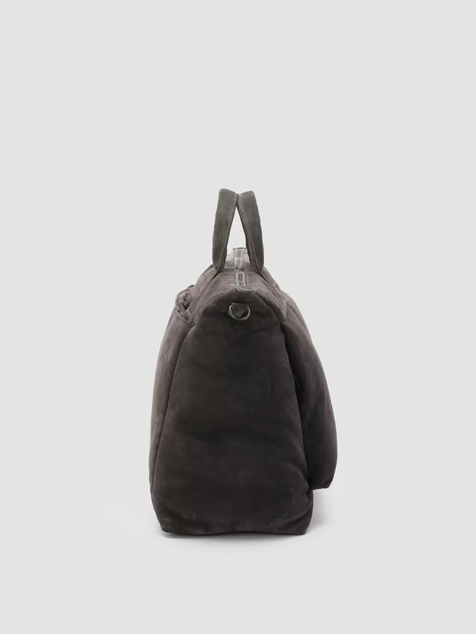 Our Helmet handcrafted bag reveals a roomy and practical silhouette that is decidedly unique. It is made by our peerless artisans from fine grey airbrushed smooth suede and features two padded leather top handles two-way zipped main compartment two front pockets with concealed side zip leather tab with embossed lettering logo adjustable and detachable shoulder strap back zip pocket suede lining two inner pockets one of which with zip and antiqued gold-tone metal hardware.