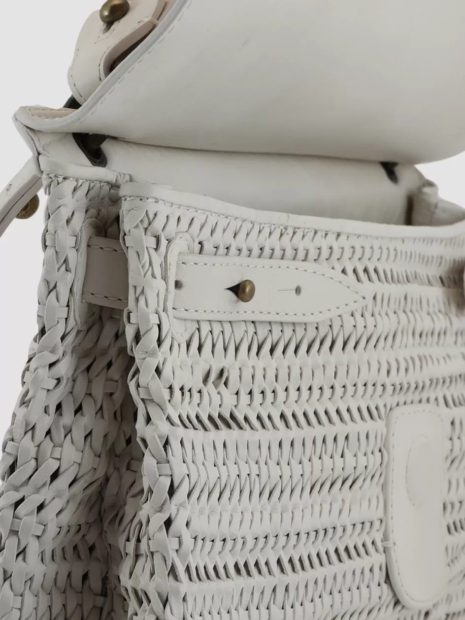 The Nolita 16 leather handle bag features a distinctive handwoven off-white body perfectly complemented by a smooth leather flap that secures with a discreet magnetic closure, a sleek handle, antique-finish metal hardware and a detachable strap.