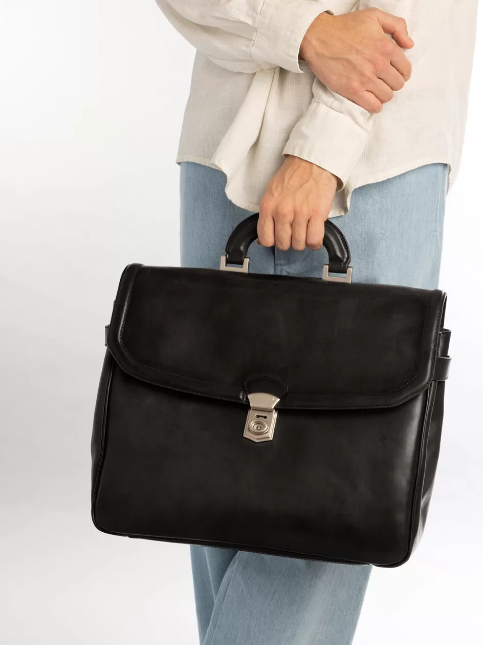 The Quentin 011 briefcase is the epitome of professional elegance, seamlessly blending functionality with high-end aesthetic. Meticulously handcrafted in Italy from the finest black leather, this bag boasts a sleek design, equipped with robust top handles and an optional detachable shoulder strap for versatile carrying options.
