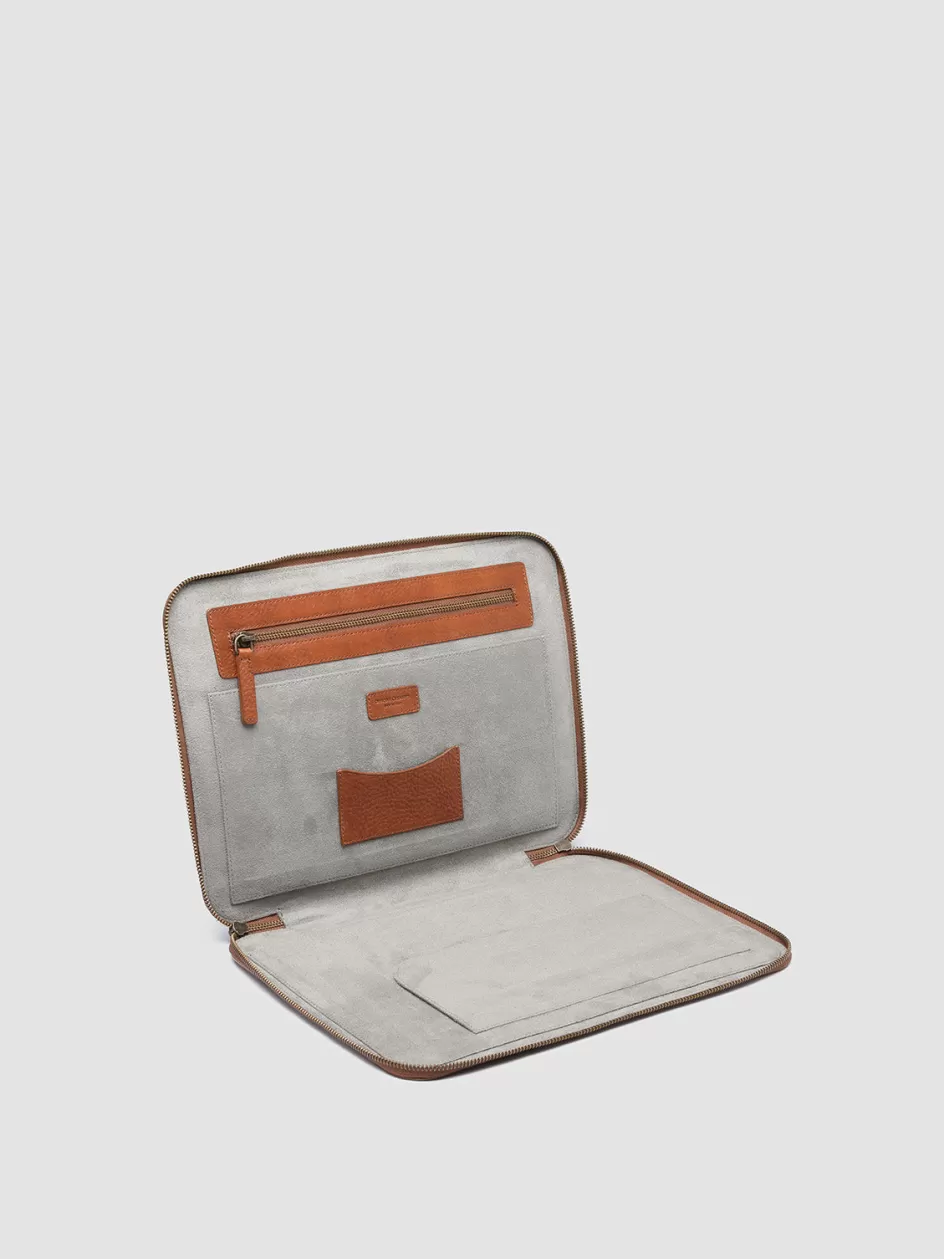The Rare 031 briefcase is handcrafted from brown leather and exudes a timeless charm. It features a full-zip closure and is distinguished by a textured finish. The fabric-lined interior is equipped with card slots and a zippered pocket.
