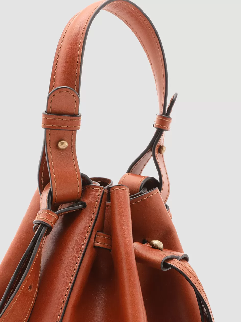 Elegant and refined, our Saddle bucket bag is handcrafted from premium smooth light brown leather and defined by a rounded silhouette with black leather profile and antiqued gold-tone metal hardware. It features a top handle, adjustable shoulder strap and main compartment closed with drawstring.