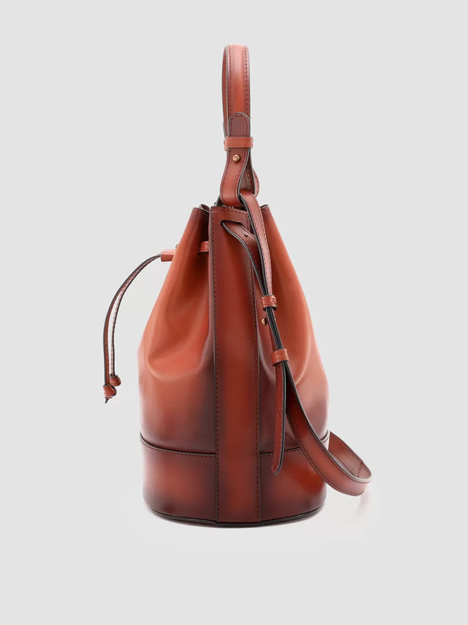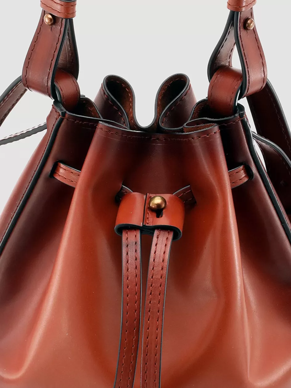 Our Saddle bucket bag in supple rhum-tone airbrushed leather catches the eye thanks to the versatile and refined design made with care by hand by our peerless artisans. It reveals a top handle and an adjustable and detachable strap to style it comfortably on the shoulder or as a crossbody drawstring fastening rounded and rigid bottom on which our lettering logo stands out and antiqued gold-tone metal hardware.