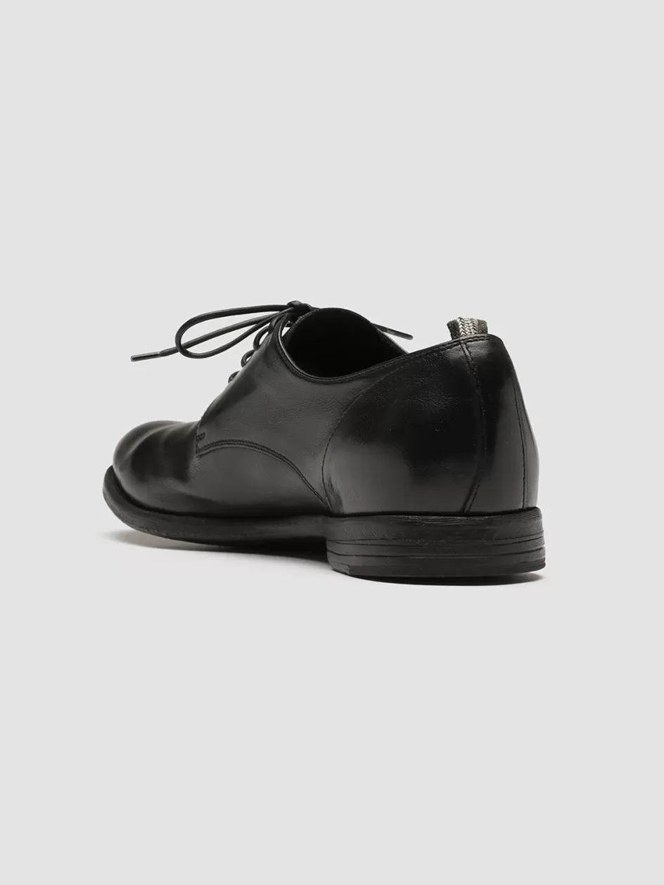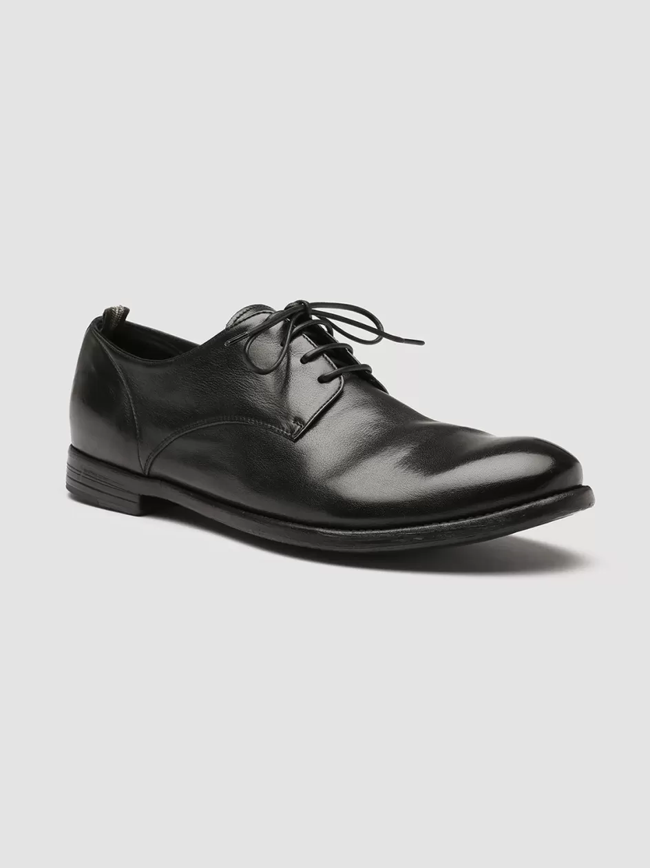 Comfortable and timeless design for our Arc handcrafted derby shoes in fine black smooth leather. They feature a rounded almond toe fine waxed laces our signature grosgrain heel pull tab and a caoutchouc sole with a stacked heel.