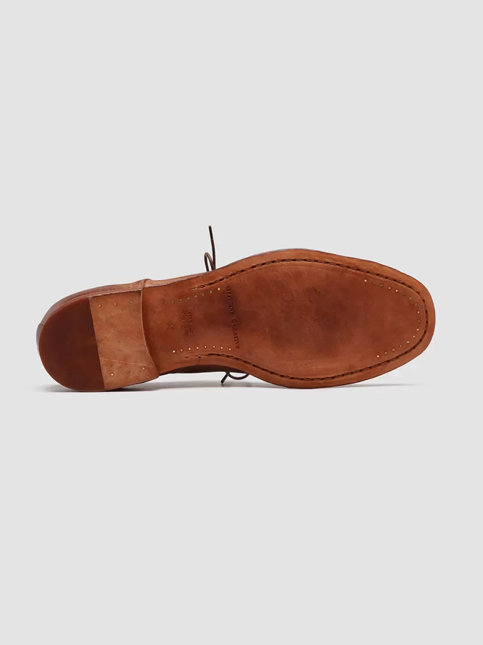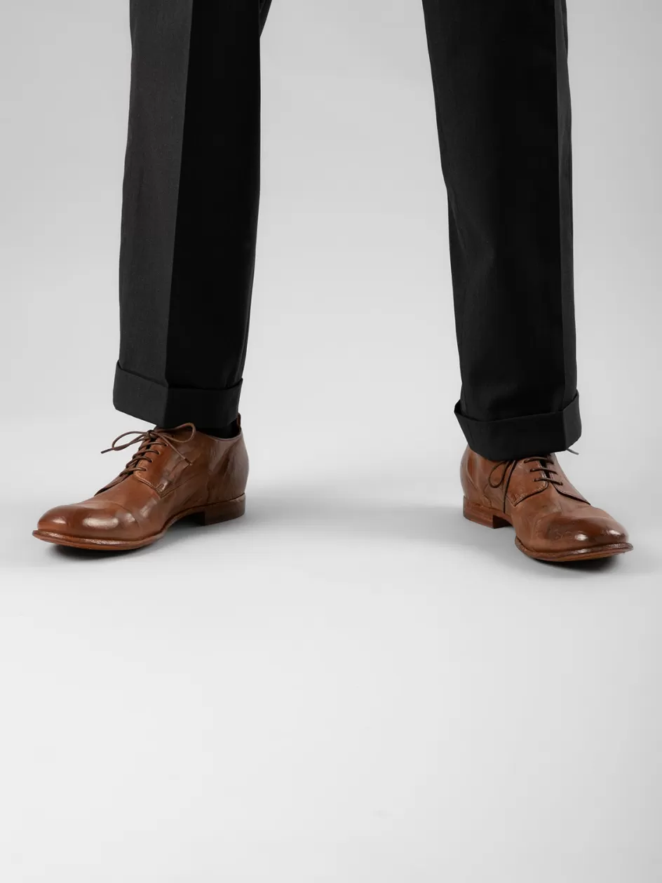 Come in a refined and warm tan nuance our versatile Stereo derby shoes feature a unique and sleek silhouette. They are handcrafted from soft and fine vintage-effect leather and reveal thin waxed laces rounded almond toe leather heel pull tab a leather sole with a stacked heel.