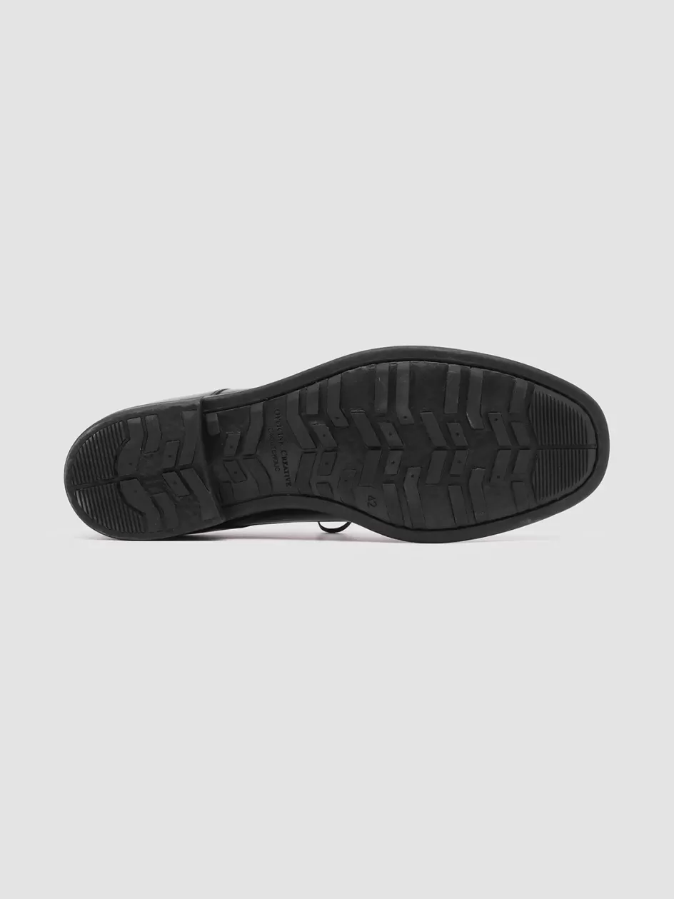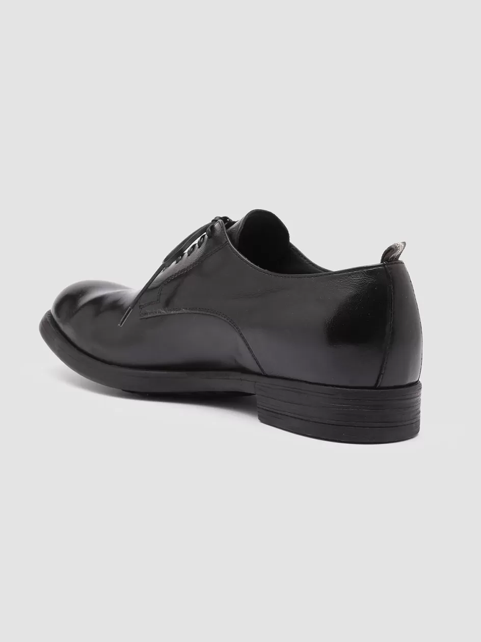 Elegant versatile and timeless: our Chronicle handcrafted derby shoes in black fine leather are the perfect footwear to show off at any time and season. They feature a silhouette with a rounded almond toe front closure with thin waxed laces our signature grosgrain heel pull tab and a sturdy caoutchouc sole with a stacked heel and grip bottom.