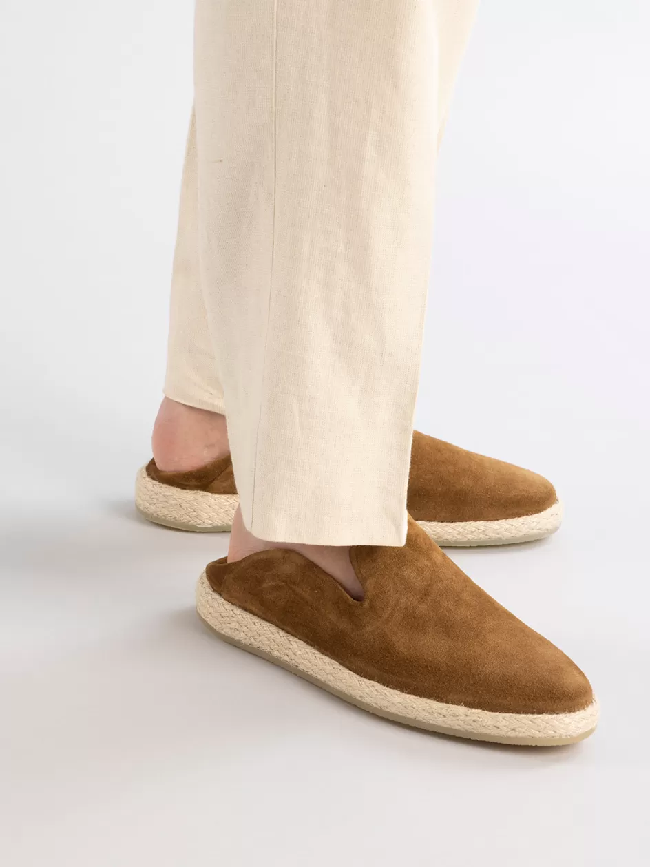 Our comfortable Roped slip ons can also be worn as slippers thanks to the foldable back panel. They are handcrafted from brown plush suede and feature a rounded toe design signature grosgrain heel loop and a woven raffia sole and crepe rubber outsole.