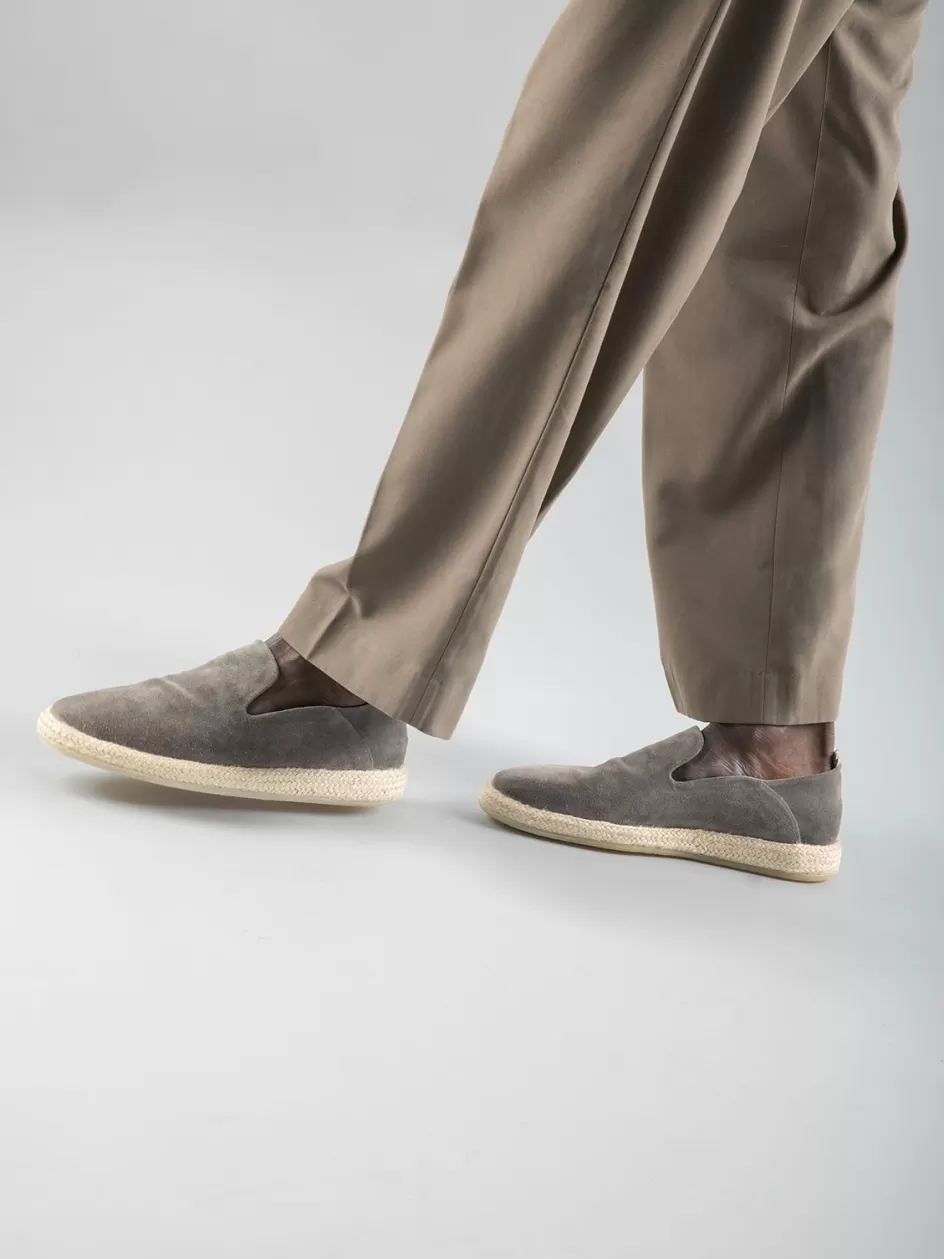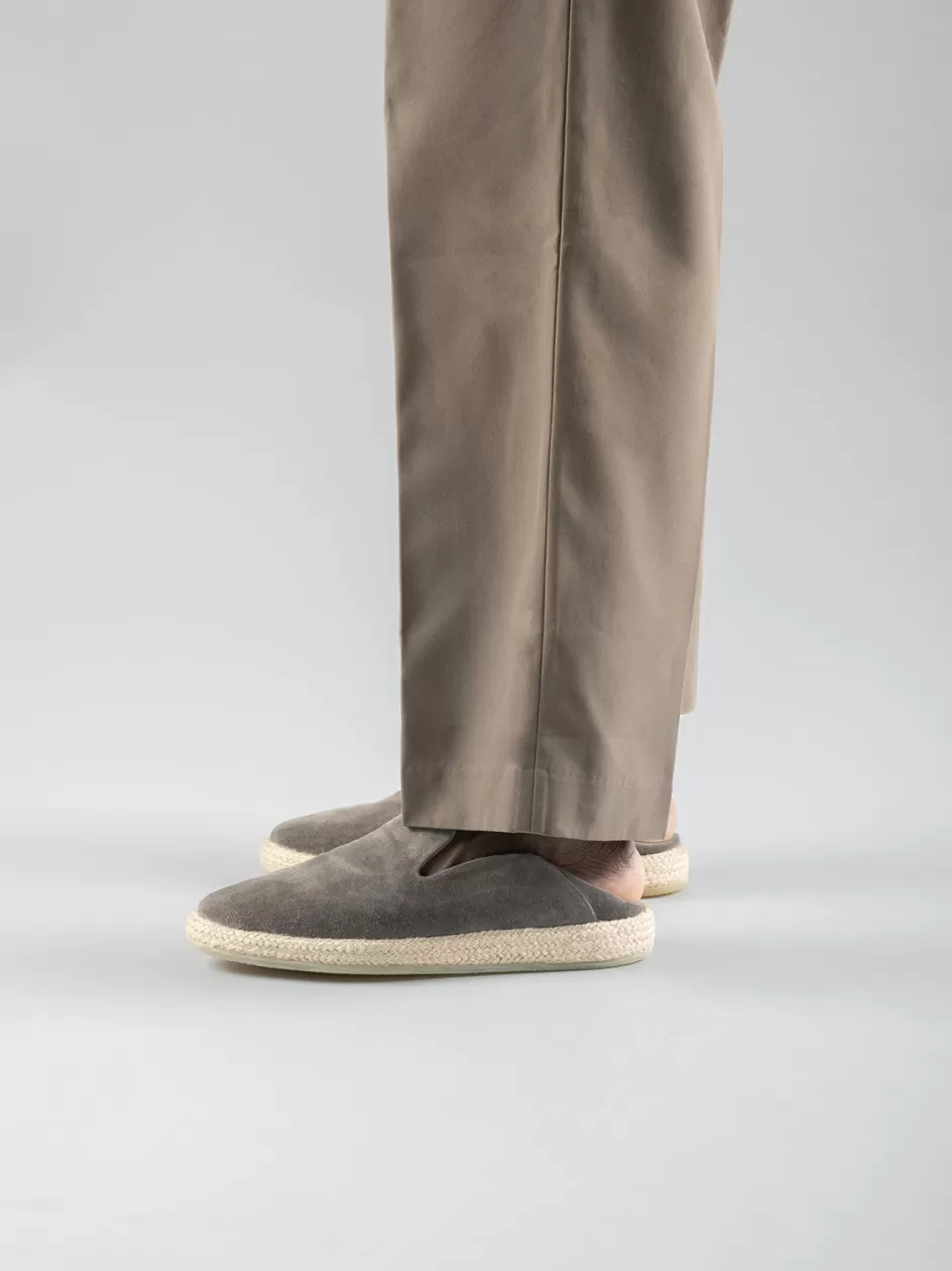 Our comfortable Roped slip ons can also be worn as slippers thanks to the foldable back panel. They are handcrafted from taupe plush suede and feature a rounded toe design signature grosgrain heel loop and a woven raffia sole and crepe rubber outsole.