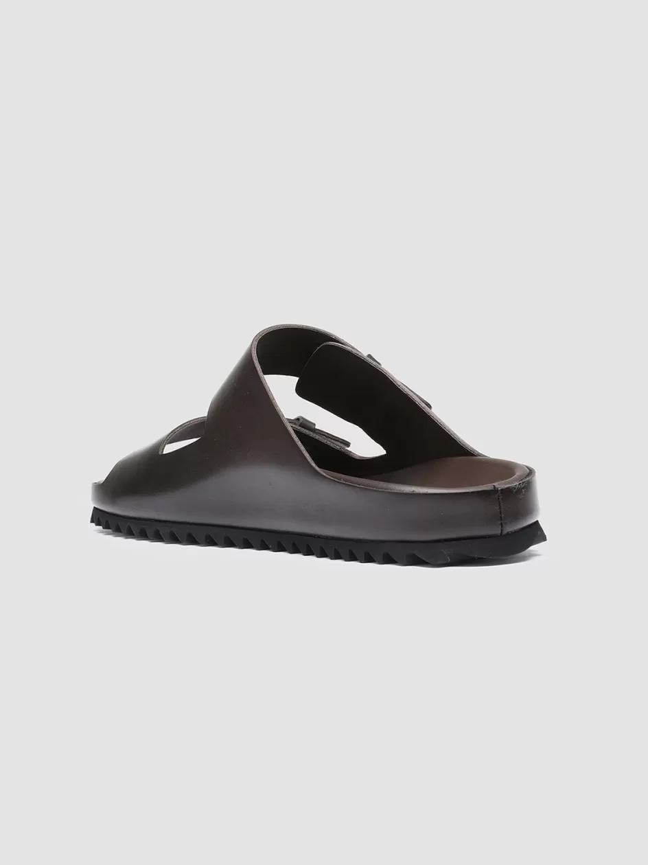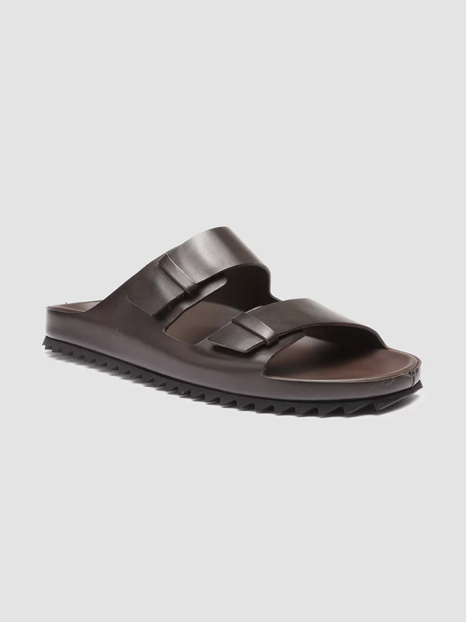 Our Agorà slides sandals perfectly combine comfort and contemporary style. Handcrafted from smooth coffee-tone premium leather they reveal a seamless design two straps with loops rounded toe built-in rubber sole and a black tread rubber outsole.
