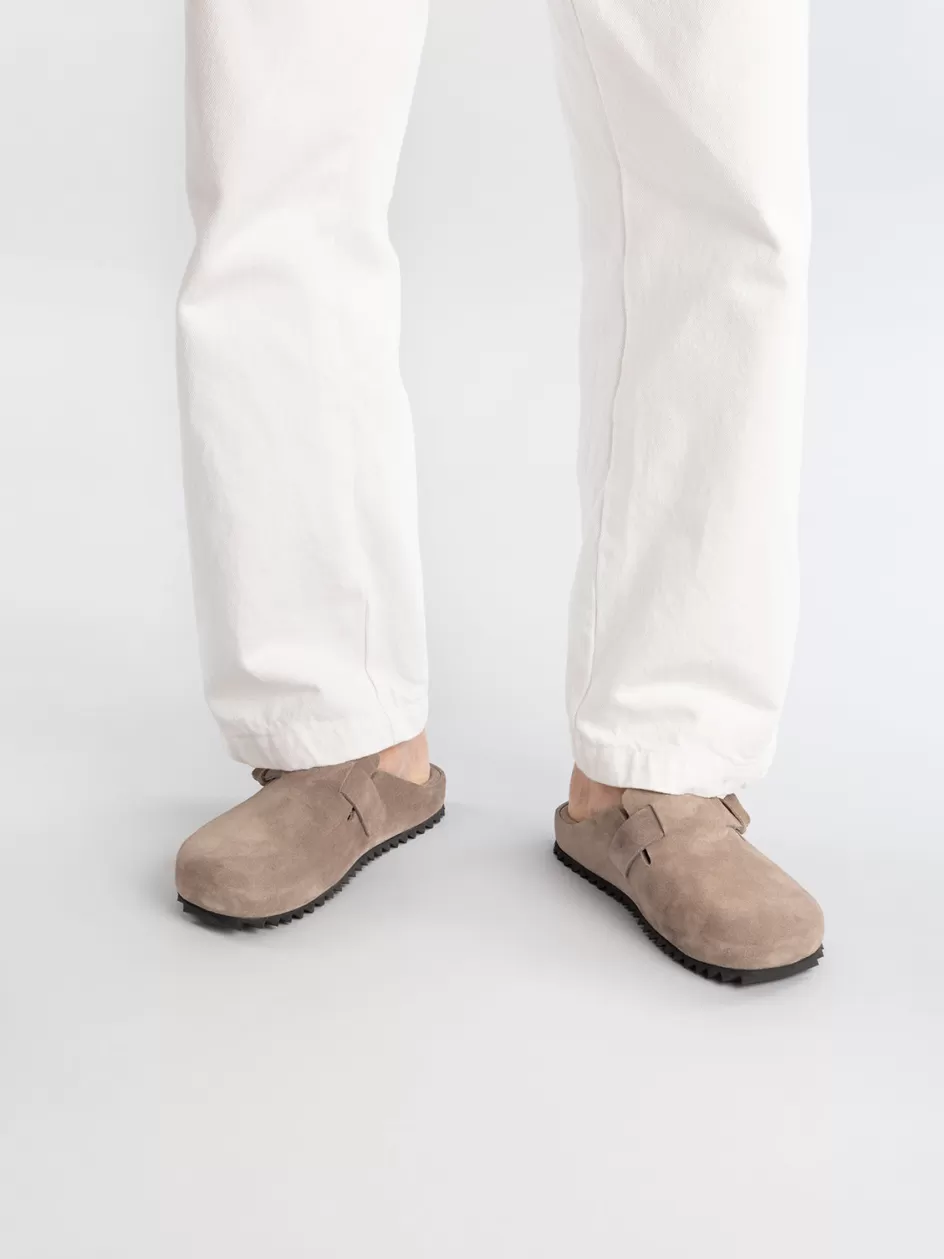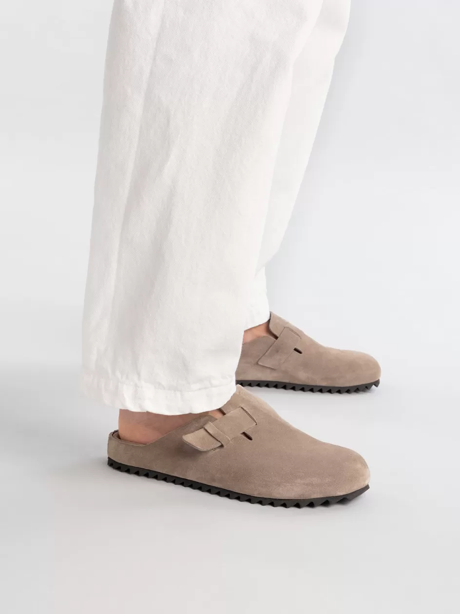 A contemporary and leisure silhouette distinguishes our Agorà slippers handcrafted from premium suede. They set on a gritty black tread rubber outsole and reveal a rounded toe a seamless design strap with loop and a comfortable molded insole.