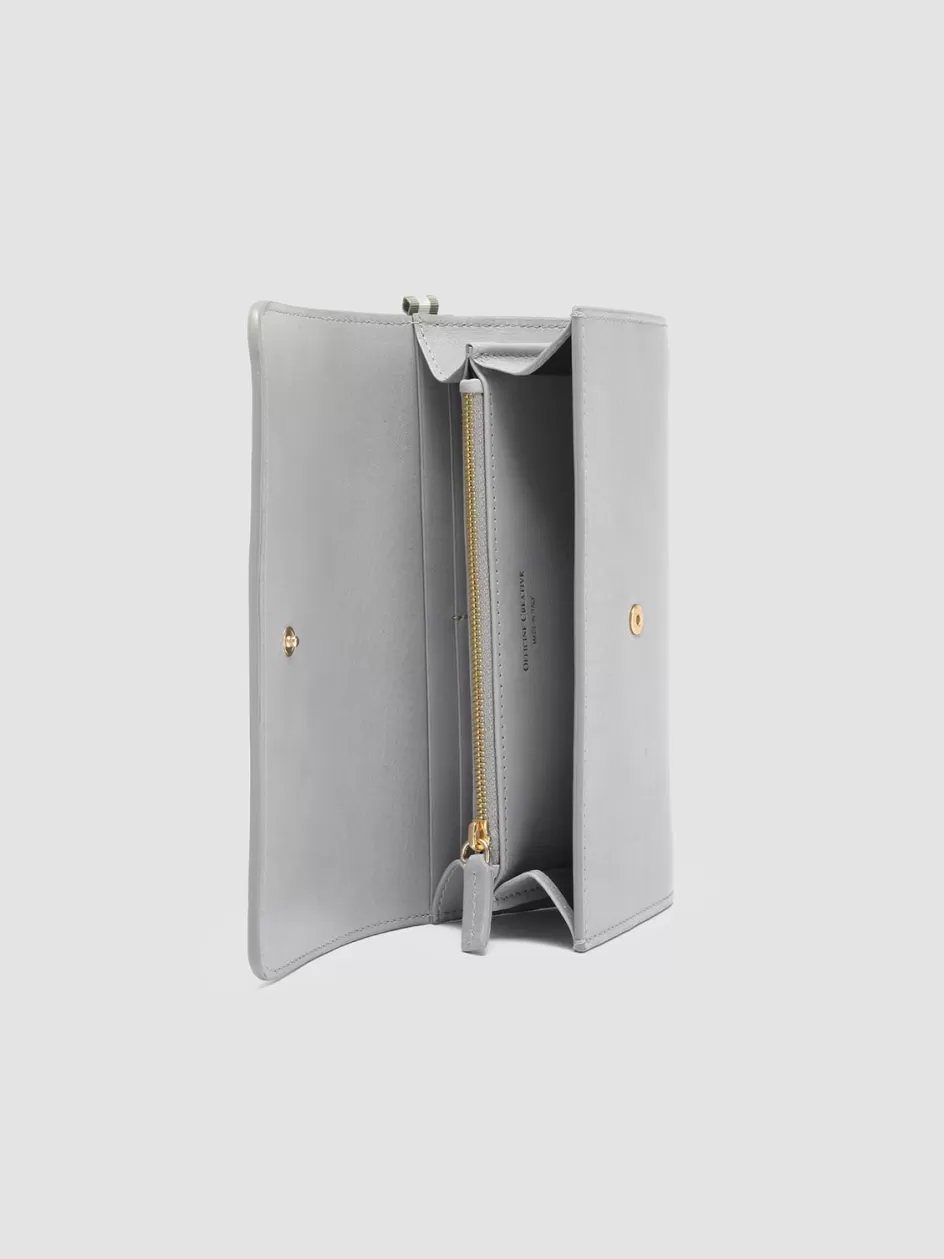 Our Poche elongated wallet is handcrafted from premium grey leather and is personalized with our golden lettering logo printed on the flap. It features a snap button closure, two internal compartments with a central zip pocket, multiple card slots and gold-tone metal hardware.