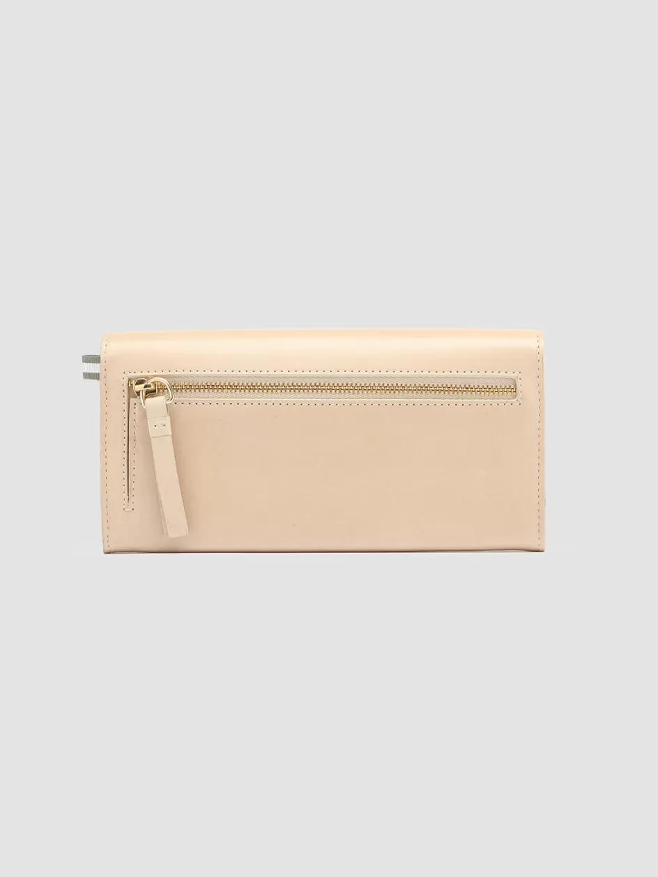 Sleek and refined our Poche elongated wallet is expertly handcrafted by our artisans from fine cream-tone nappa leather. It features a flap on which our golden lettering logo stands out snap button fastening a back zip pocket two internal compartments divided by a zip pocket card slots signature grosgrain loop tab on the side and gold-tone metal hardware.