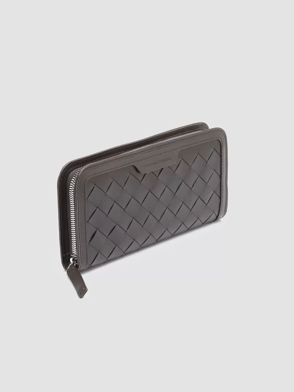 Elegance and practicality come together to perfection in our Bergé wallet in fine coffee-tone woven leather. It is expertly handcrafted by our artisans and reveals smooth tone-on-tone leather edges leather tab with embossed lettering logo at front zip around fastening two internal compartments with central zipped pocket card slots silver-tone metal hardware and iconic grosgrain side loop tab.