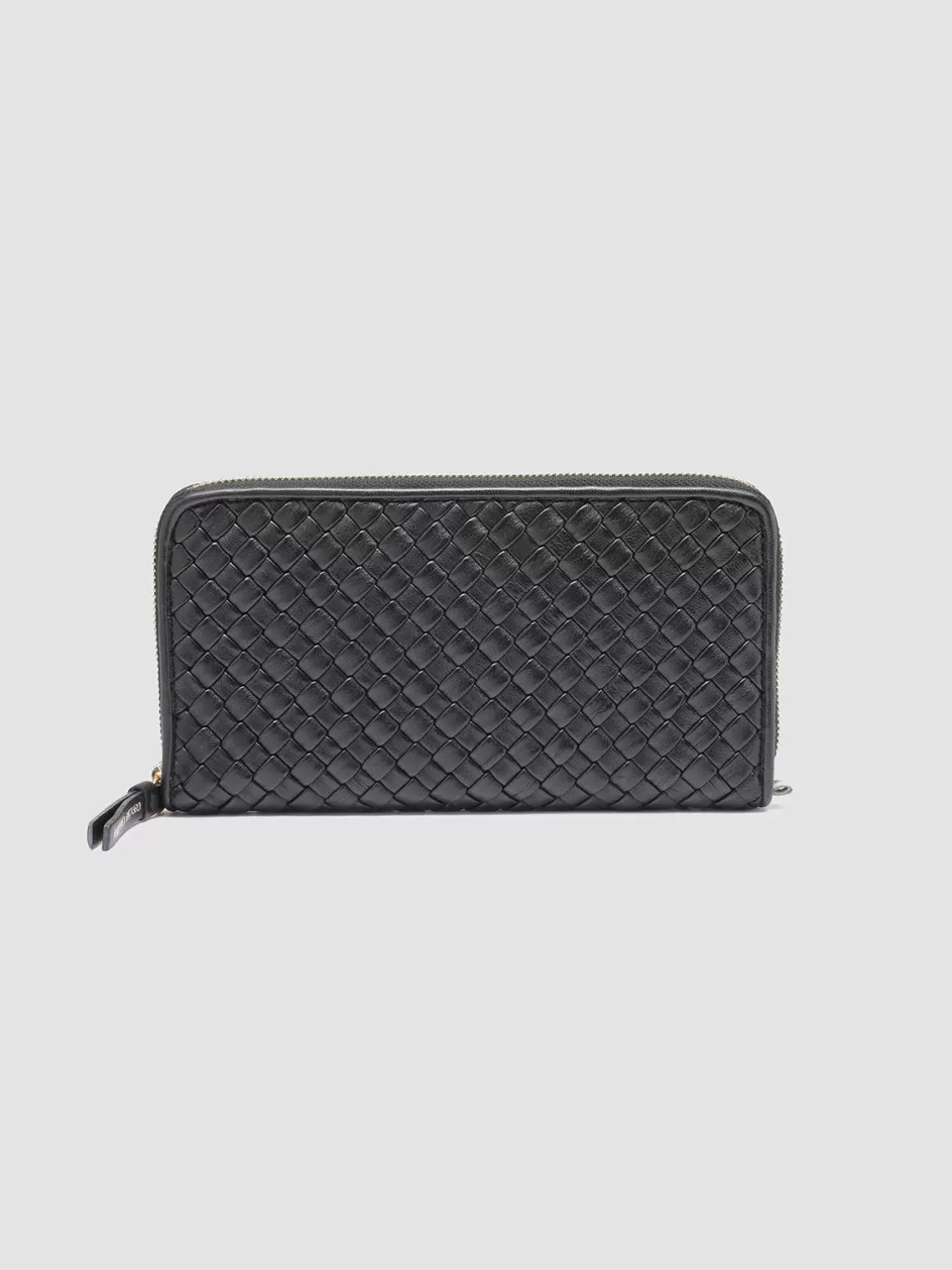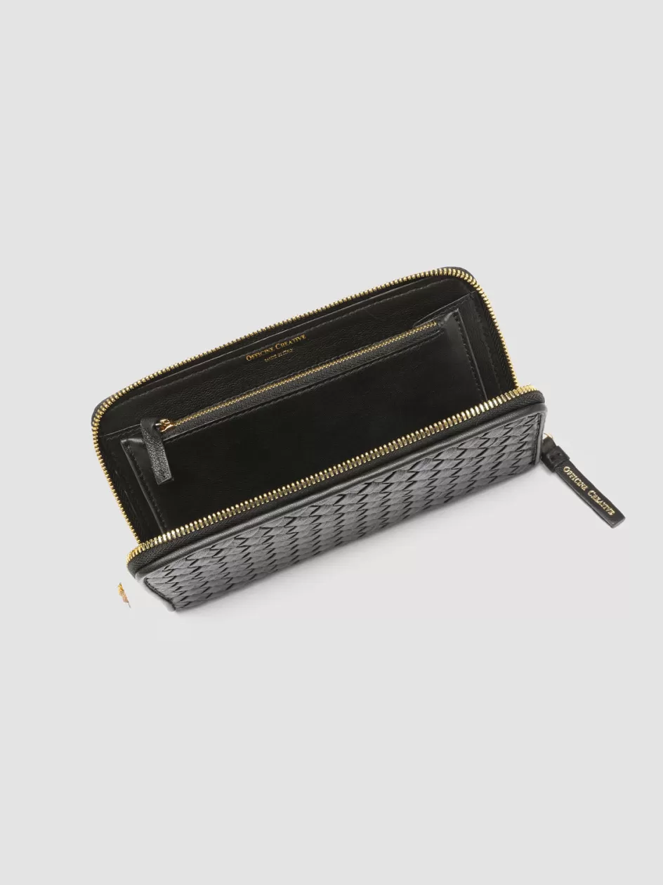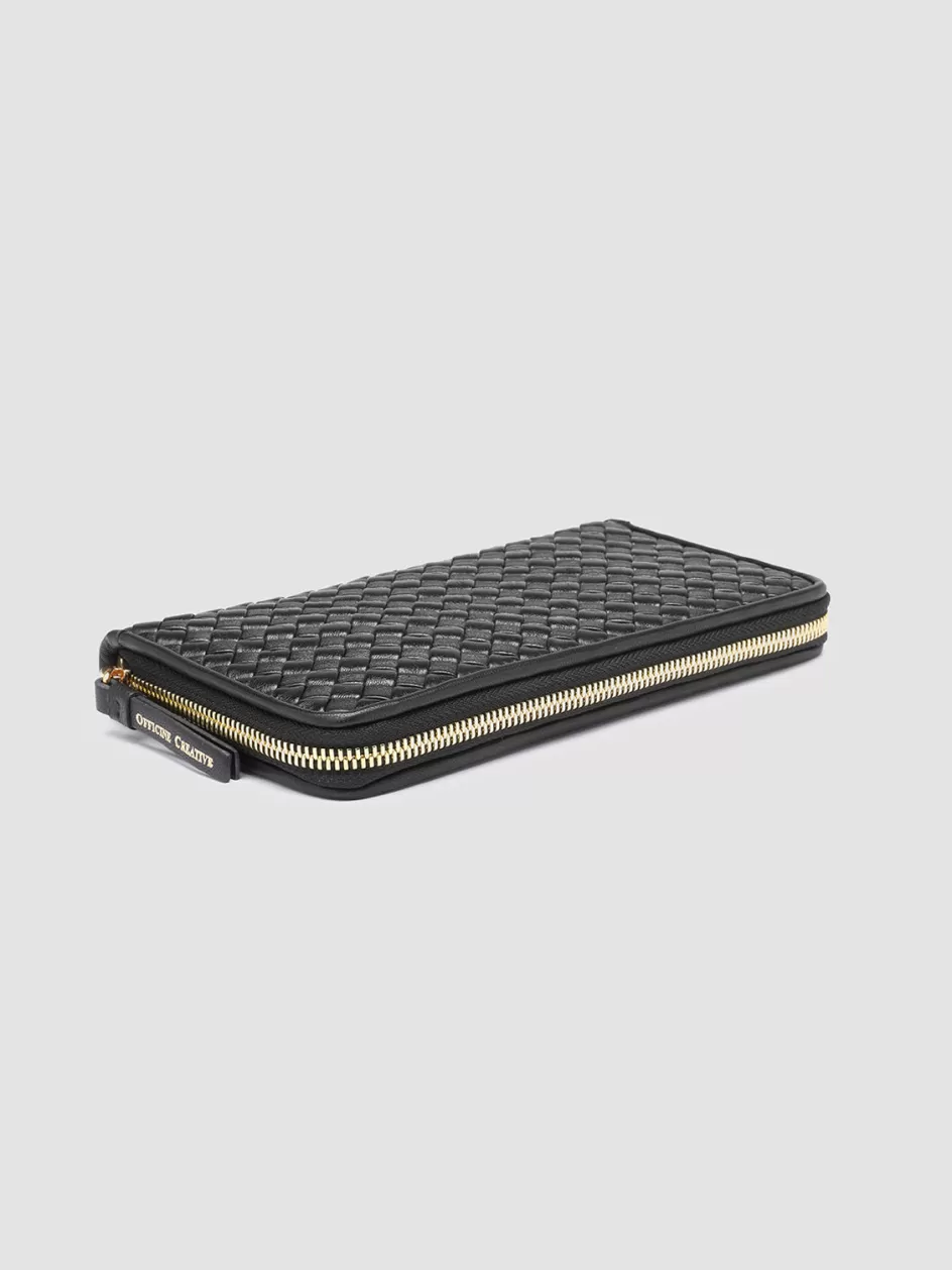 Comes in a brilliant shade of black our Juliet artisan wallet is handcrafted from fine finely woven smooth leather. It features a gold-tone zip around closure inner zipped pocket and open pocket multiple card slots and logo lettering embossed at the zip sliders.