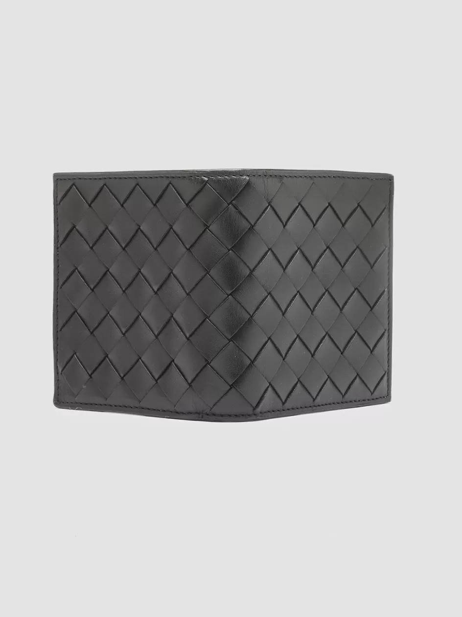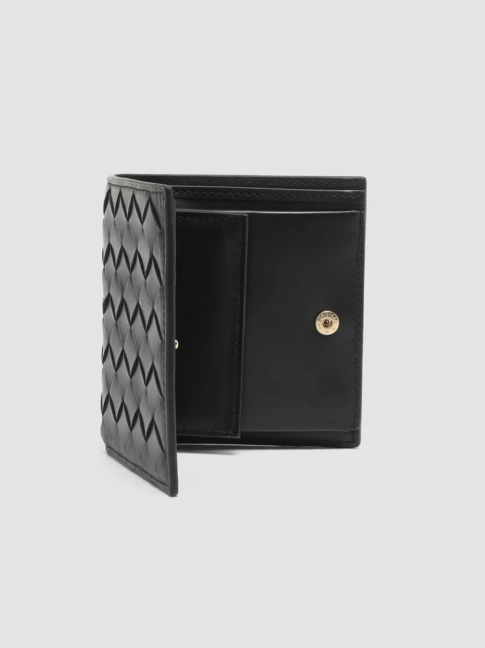 Our Juliet artisan bifold wallet features a small and compact design perfect for holding your essential documents with great elegance. It’s handcrafted from fine black woven leather on the outside and smooth on the inside and has a snap button closure card and bill compartments a flap pocket and gold-tone lettering logo print.