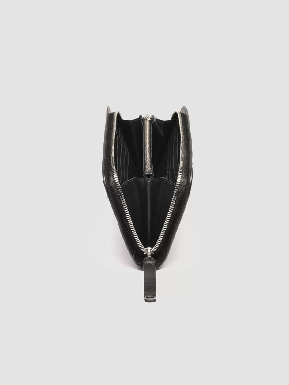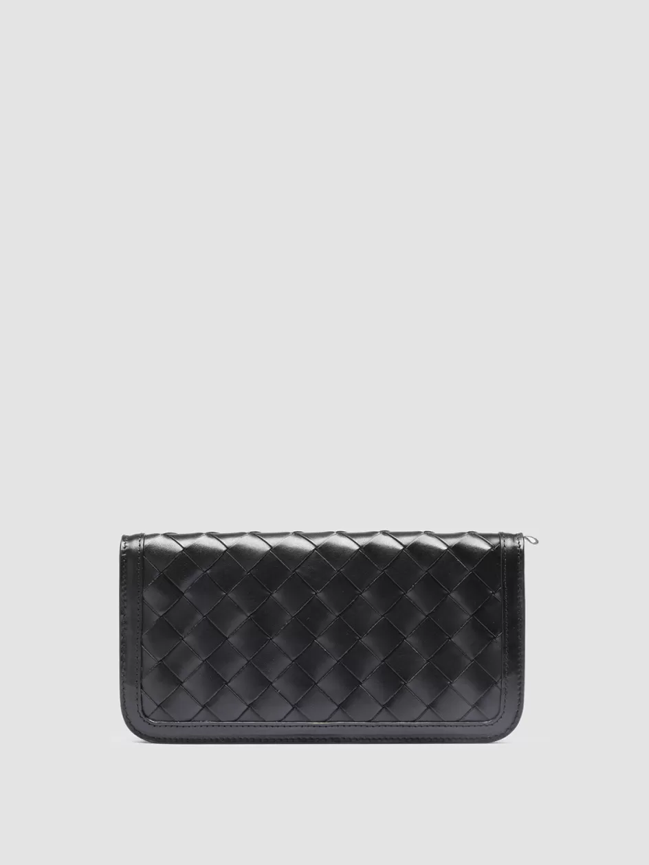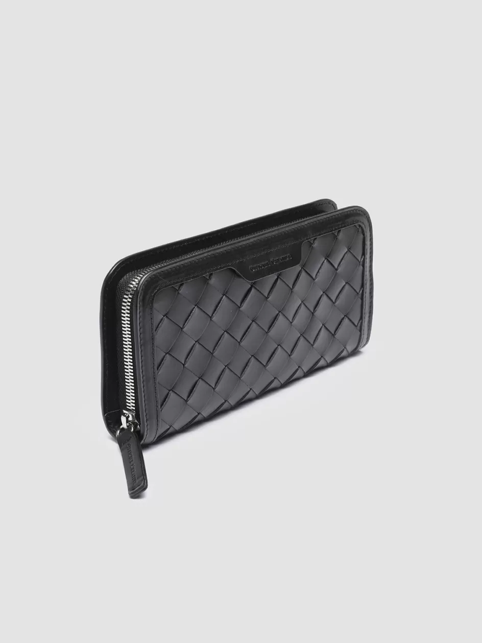 Elegance and practicality come together to perfection in our Bergé wallet in fine black woven leather. It is expertly handcrafted by our artisans and reveals smooth tone-on-tone leather edges leather tab with embossed lettering logo at front zip around fastening two internal compartments with central zipped pocket card slots silver-tone metal hardware and iconic grosgrain side loop tab.