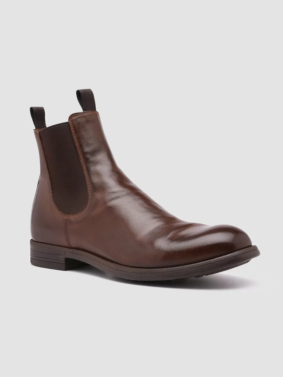 Versatile and very comfortable our Chronicle Chelsea boots feature a contemporary style. They are made by our skilled artisans from brown fine leather and characterized by a rounded almond toe elasticized side inserts for a perfect fit two original grosgrain pull tabs and a caoutchouc grip sole with a stacked heel.