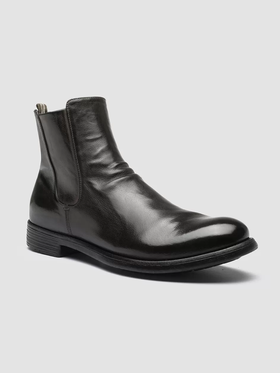 Comfort and style go hand in hand in our artisan Hive boots from black smooth soft leather. Their pared-back and timeless silhouette reveals a rounded almond toe our distinctive grosgrain heel pull tab and a caoutchouc tread sole with stacked heel.