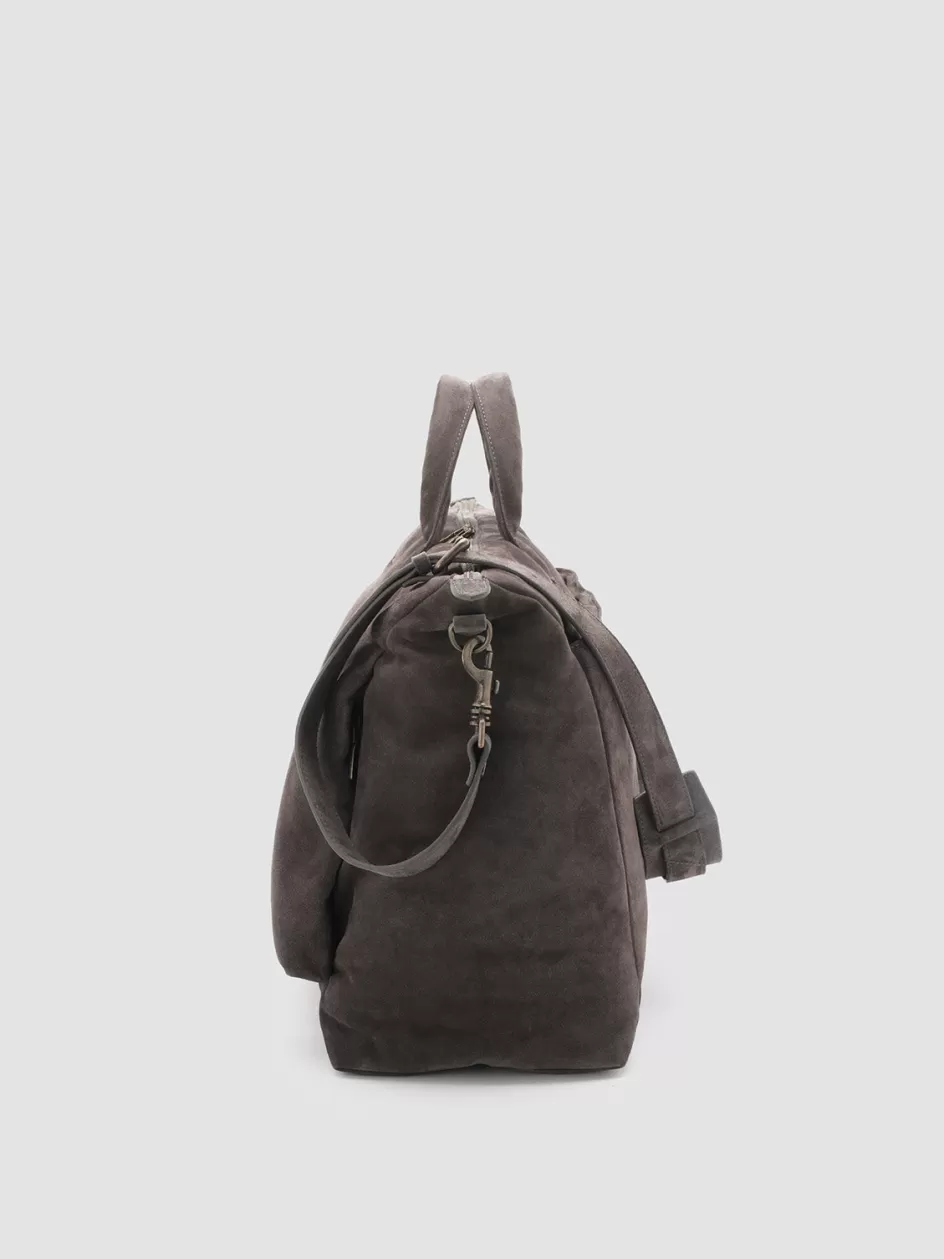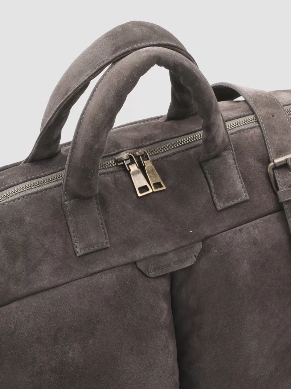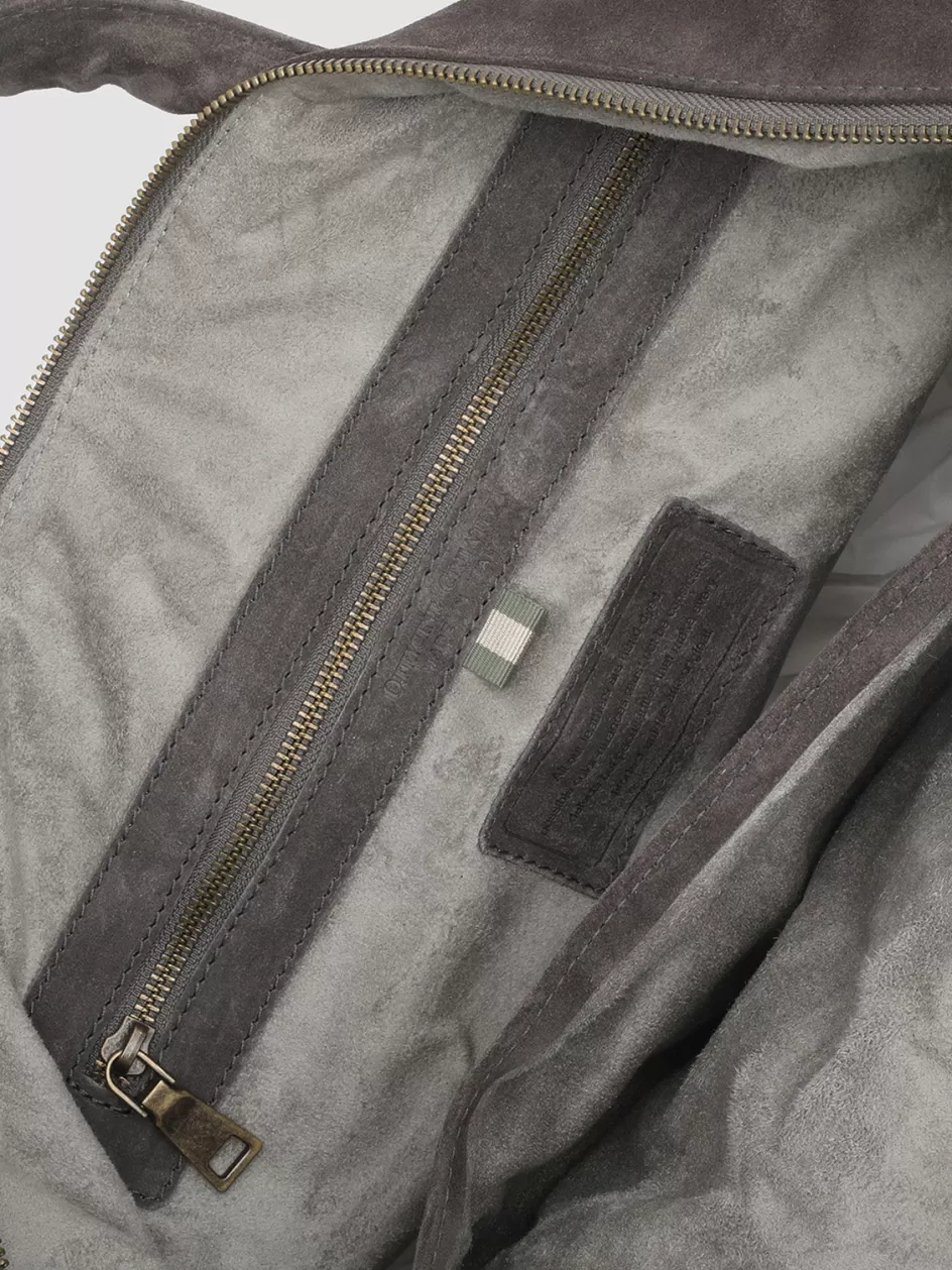 Our Helmet handcrafted bag reveals a roomy and practical silhouette that is decidedly unique. It is made by our peerless artisans from fine grey airbrushed smooth suede and features two padded leather top handles two-way zipped main compartment two front pockets with concealed side zip leather tab with embossed lettering logo adjustable and detachable shoulder strap back zip pocket suede lining two inner pockets one of which with zip and antiqued gold-tone metal hardware.