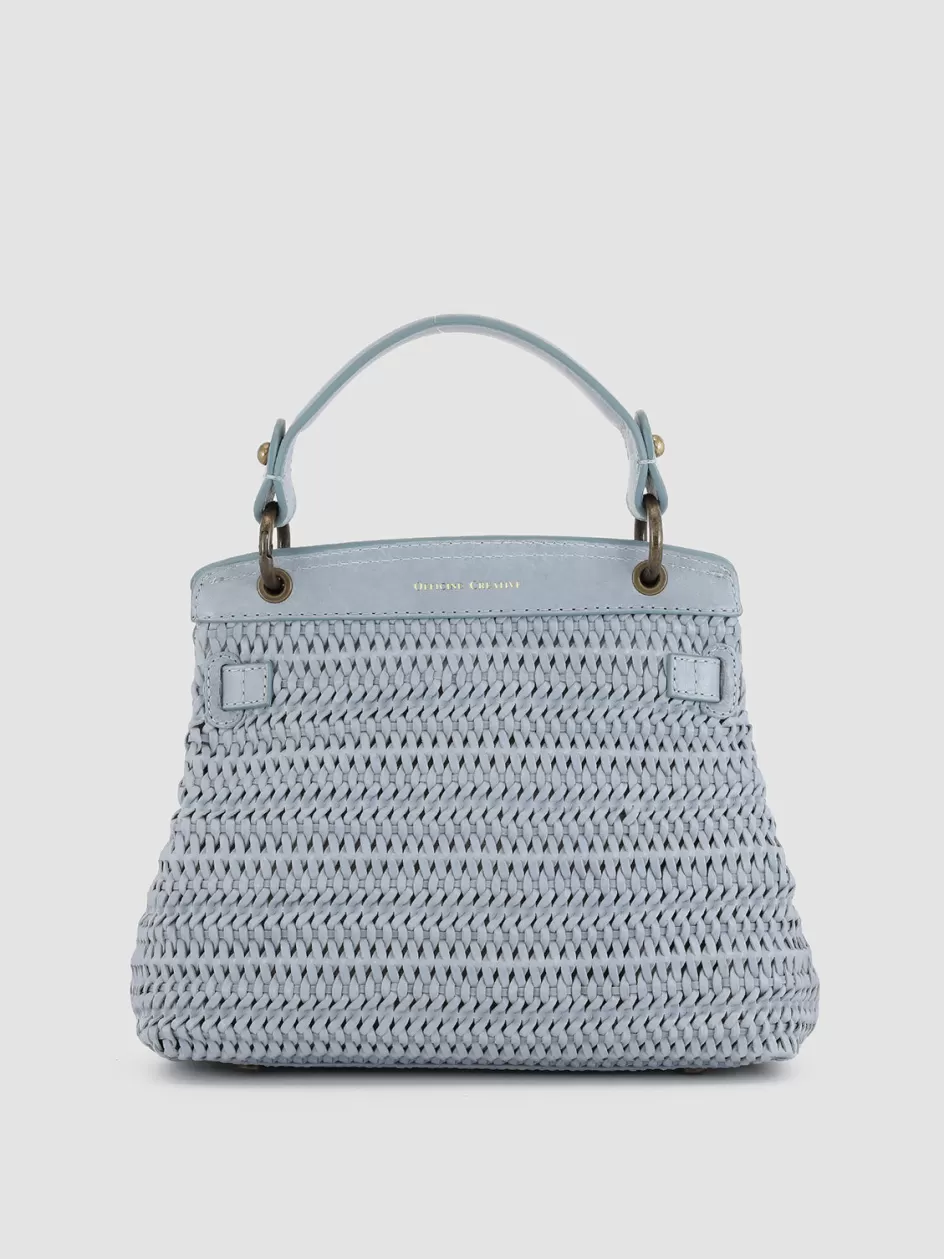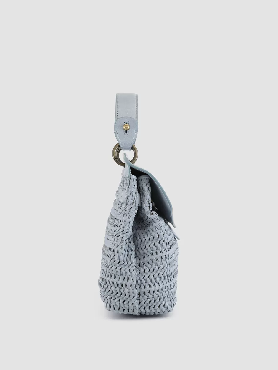 The Nolita 09 handle bag is made from premium blue leather. This model stands out with an intricately handwoven leather silhouette, featuring an accordion structure, antique-finish metal elements, a top handle and a removable strap.