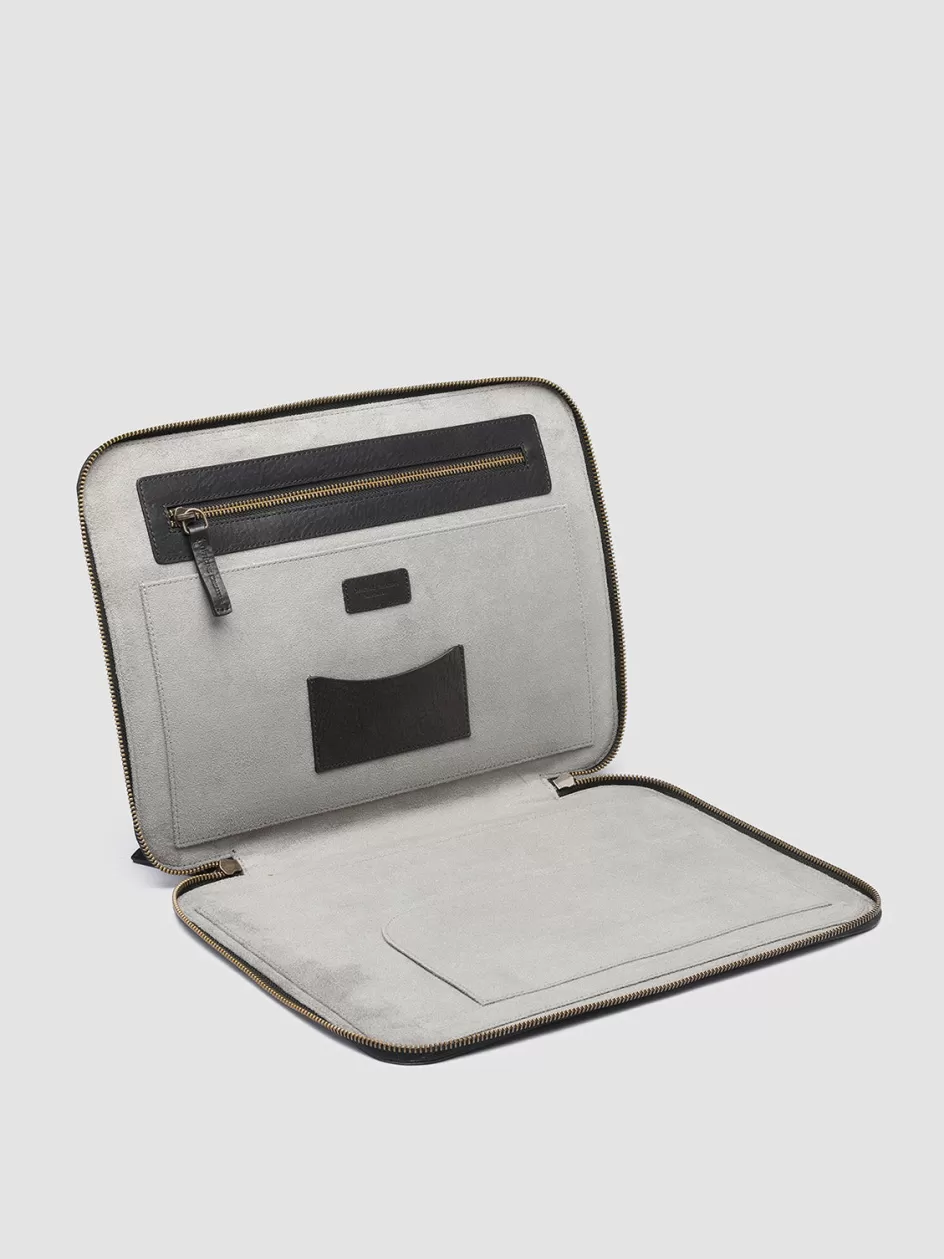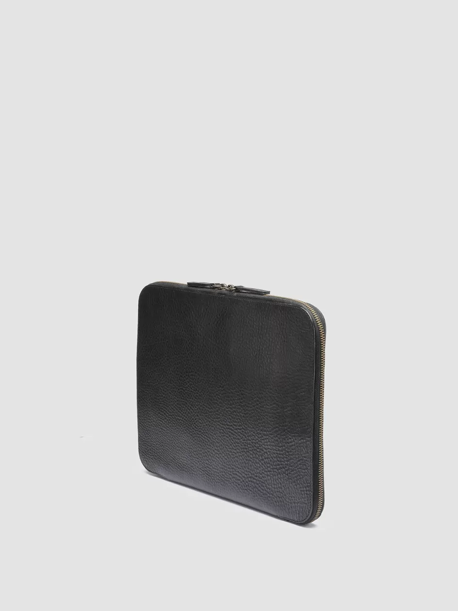 The Rare 031 briefcase is handcrafted from black leather and exudes a timeless charm. It features a full-zip closure and is distinguished by a textured finish. The fabric-lined interior is equipped with card slots and a zippered pocket.