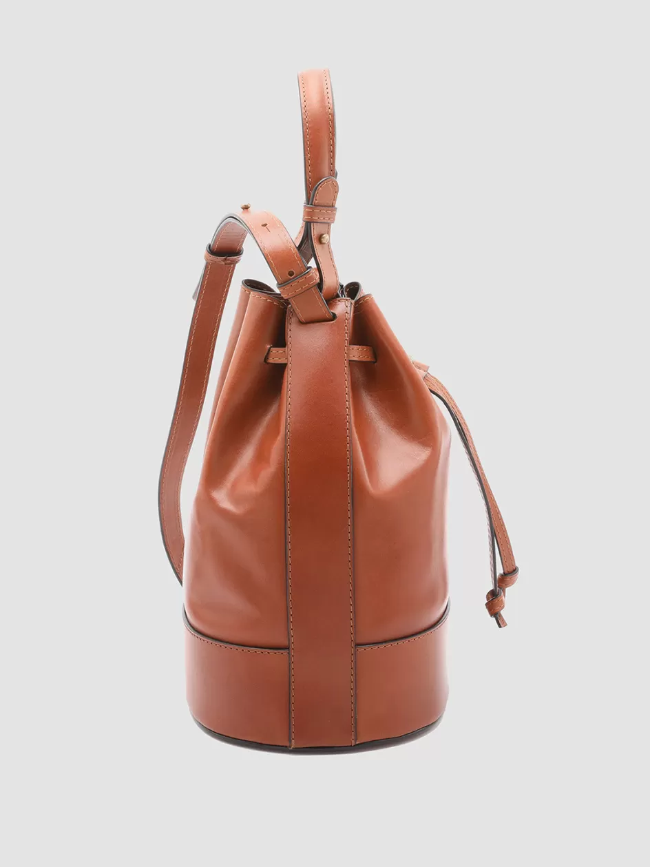 Elegant and refined, our Saddle bucket bag is handcrafted from premium smooth light brown leather and defined by a rounded silhouette with black leather profile and antiqued gold-tone metal hardware. It features a top handle, adjustable shoulder strap and main compartment closed with drawstring.