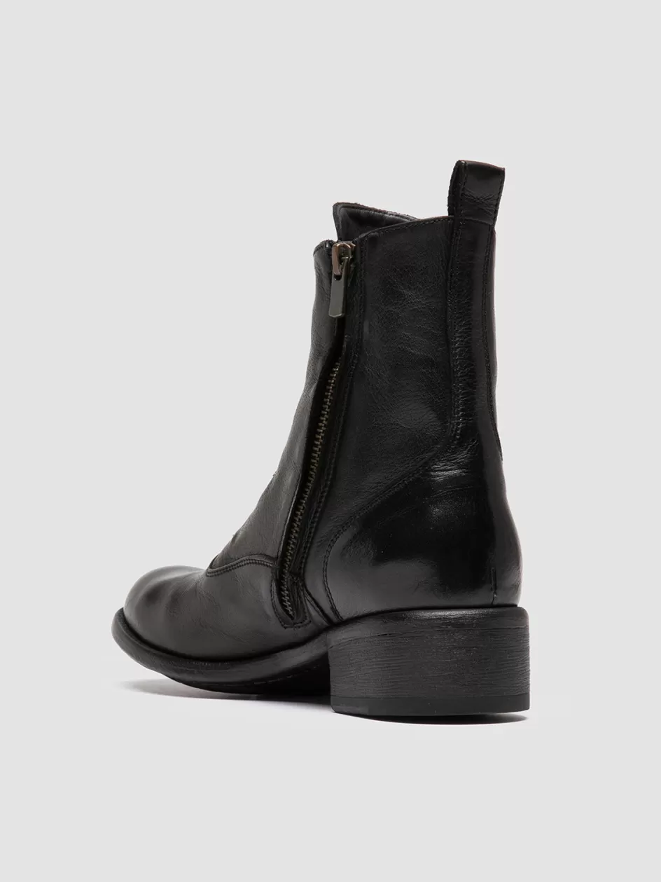 The Lis 006 ankle boots are handcrafted in Italy in black leather, showcasing a unique texturing. Featuring a hook-and-eye design with a robust side zipper and a sturdy rubber-injected sole, they blend practicality with timeless flair.