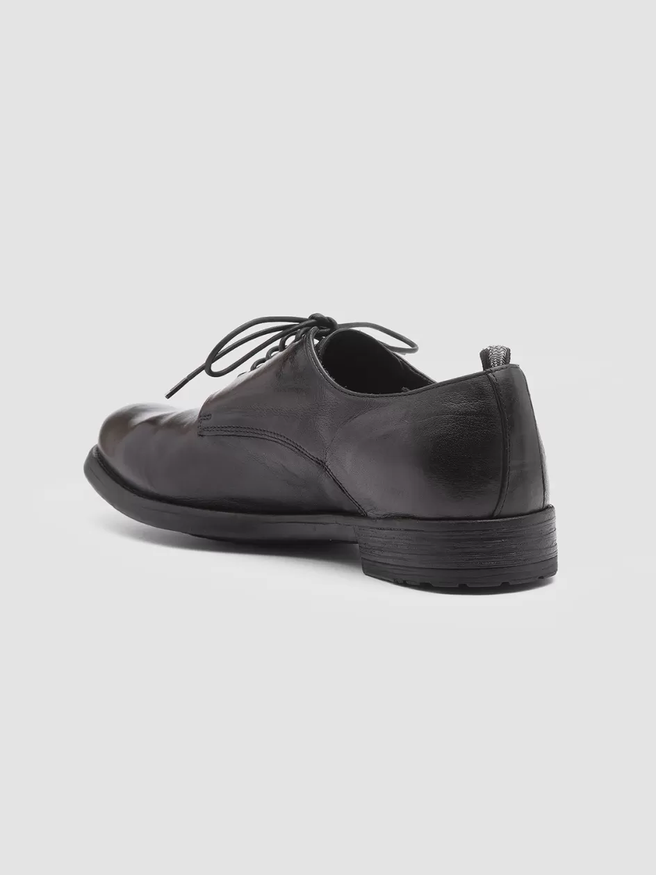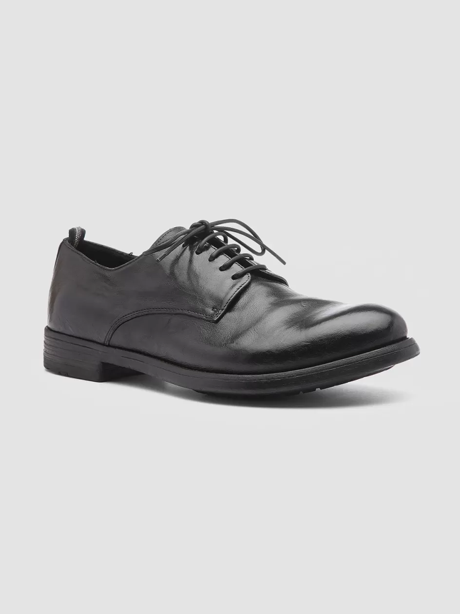 Our premium quality Hive derby shoes are a male wardrobe staple and stand out thanks to their versatile and timeless silhouette. They are crafted from fine smooth black leather and have a rounded almond toe front closure with thin waxed laces our signature grosgrain heel pull tab and a resistant caoutchouc tread sole with stacked heel.