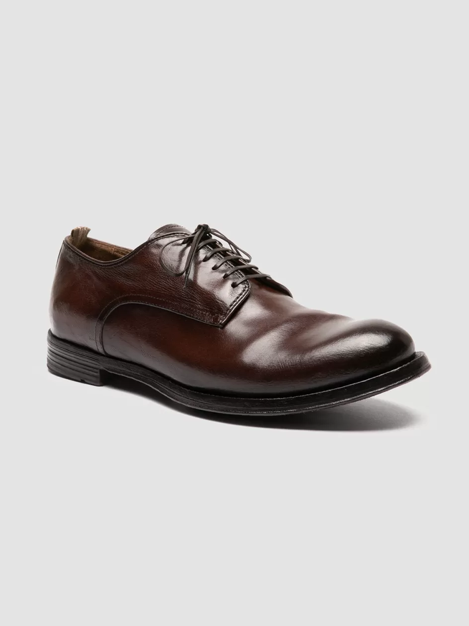 Our versatile Anatomia derby shoes are characterized by a timeless silhouette and impeccable craftsmanship. Made from soft airbrushed leather in shades of dark brown they feature an almond toe fine waxed laces signature grosgrain heel pull tab and a stacked sole with low heel and black rubber inserts.