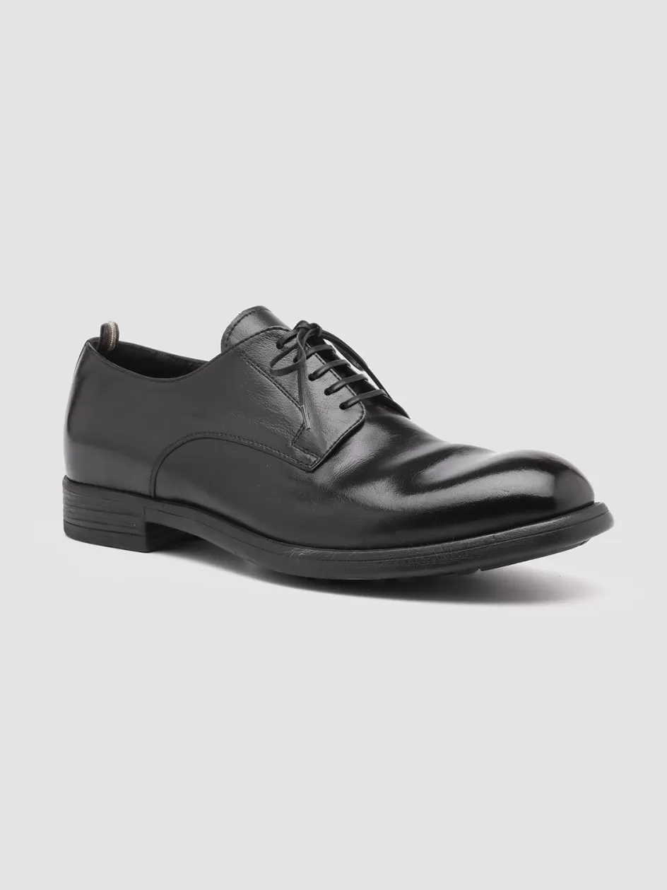 Elegant versatile and timeless: our Chronicle handcrafted derby shoes in black fine leather are the perfect footwear to show off at any time and season. They feature a silhouette with a rounded almond toe front closure with thin waxed laces our signature grosgrain heel pull tab and a sturdy caoutchouc sole with a stacked heel and grip bottom.