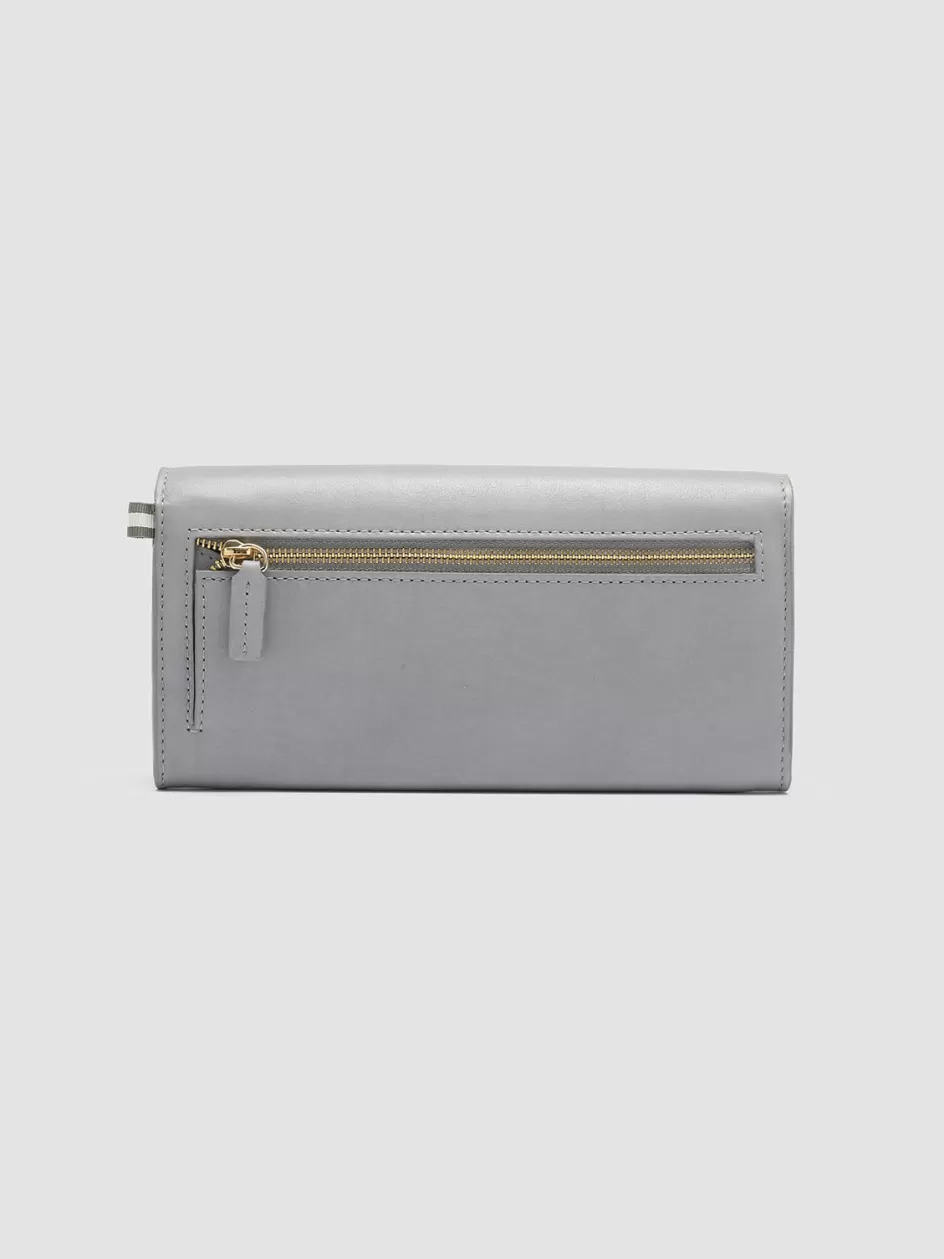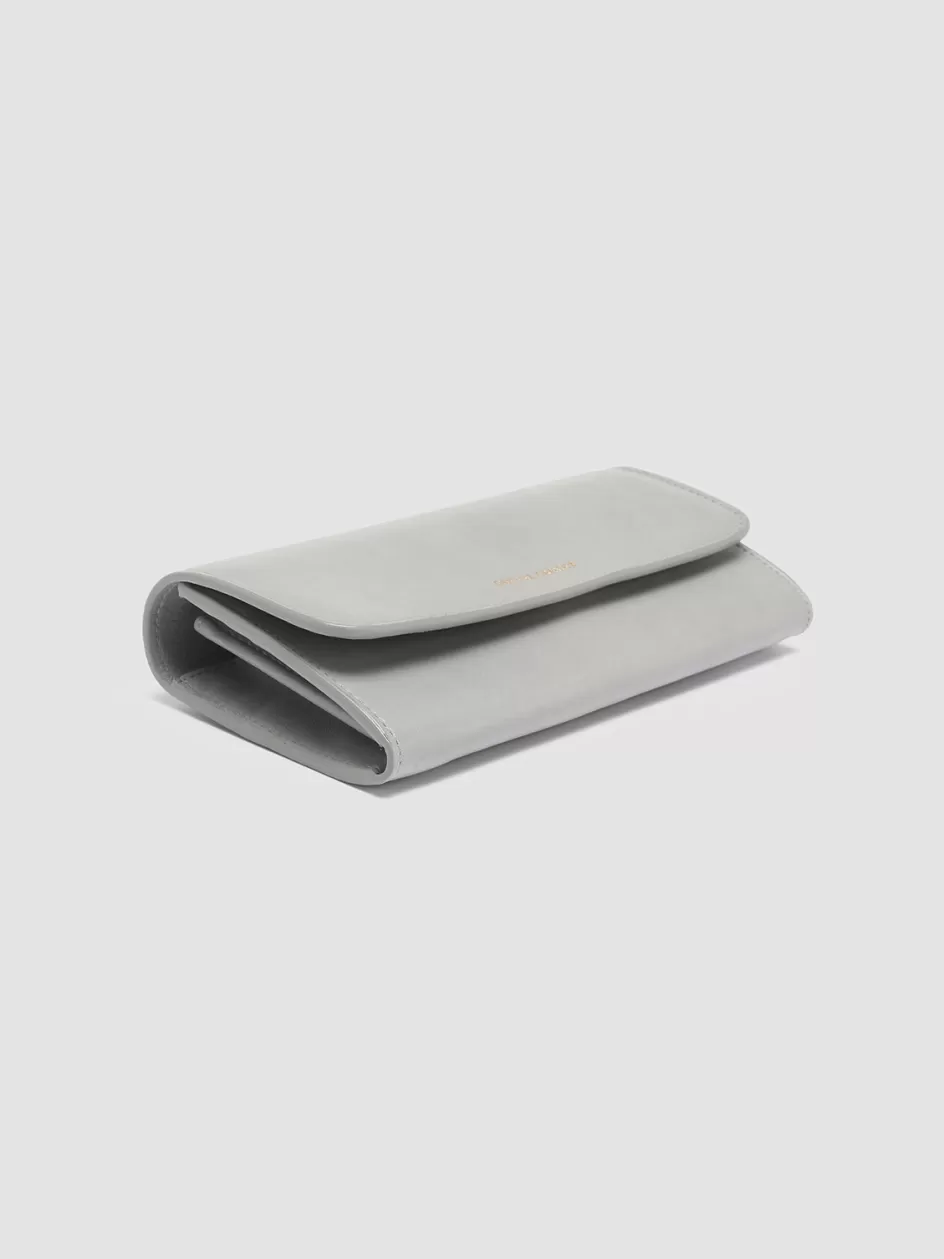 Our Poche elongated wallet is handcrafted from premium grey leather and is personalized with our golden lettering logo printed on the flap. It features a snap button closure, two internal compartments with a central zip pocket, multiple card slots and gold-tone metal hardware.