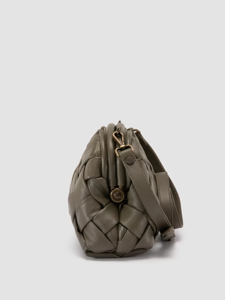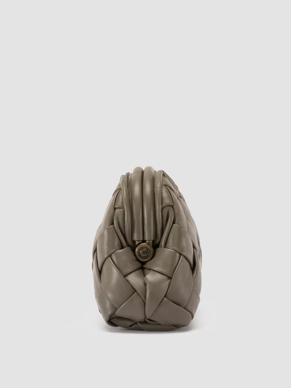 Great for special occasions and to embellish any look, our Helen small clutch bag stands out with its expertly green woven leather texture. It features two rigid top handles, adjustable and detachable thin shoulder strap, fabric lining, internal panel with magnetic button fastening and embossed lettering logo, inside zip pocket and antiqued gold-tone metal hardware.
